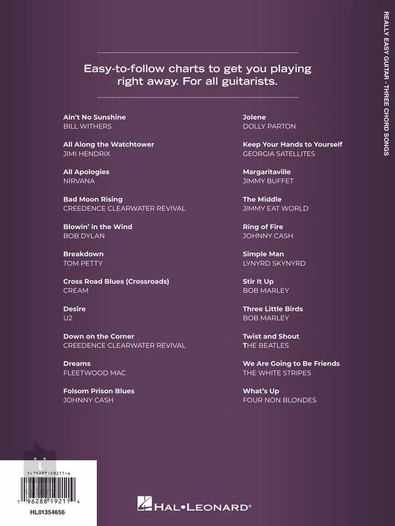 Selbst als Anfänger auf der Gitarre können Sie mit Three Chord Songs - Really Easy Guitar Ihre Lieblingssongs von U2, Nirvana, Four Non Blondes, Lynyrd Skynyrd, The Beatles und Künstlern wie Johnny Cash, Bob Dylan, Bob Marley, Dolly Parton und Bill Withers spielen. Enthält alles, was Sie brauchen - vereinfachte Drei-Akkord-Begleitungen, Gitarrentabulatur und Liedtexte.