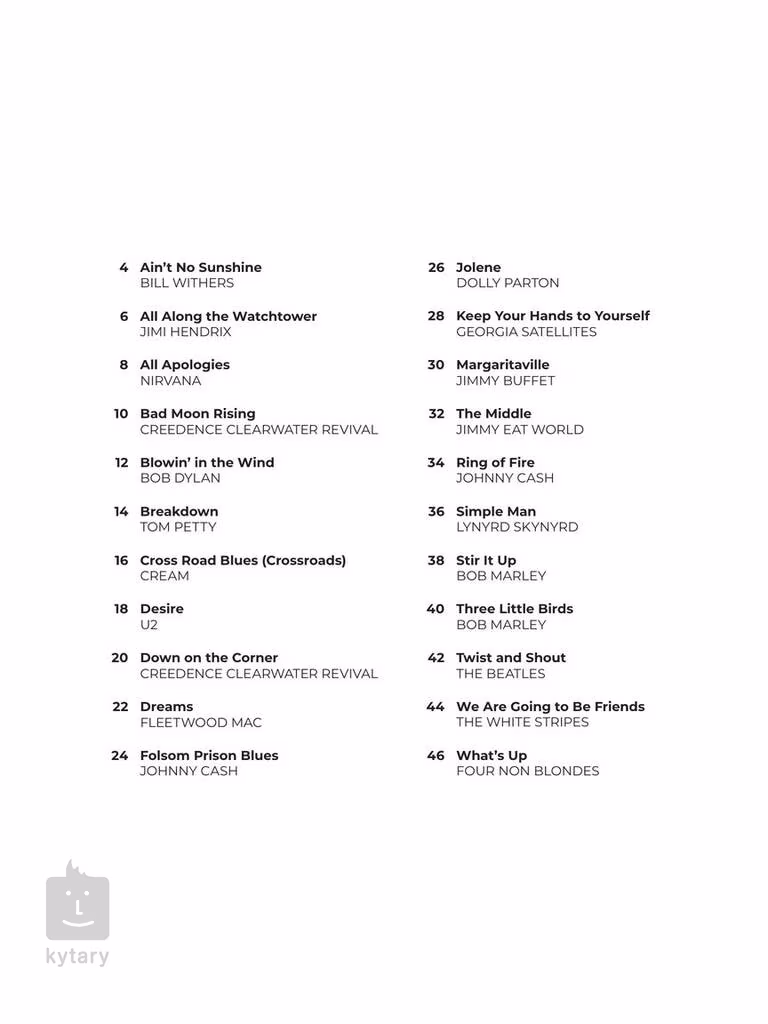 Trackliste: 1. Alle Entschuldigungen 2. Träume 3. was ist los 4. All Along The Watchtower 5. Zusammenbruch 6. Jolene 7. Ain't No Sunshine 8. The Middle 9. wir werden Freunde sein 10. Bad Moon Rising 11. Blowin' in the Wind 12. behaltet eure Hände bei euch 13. Drehen und Schreien 14. "Cross Road Blues" (Kreuzweg) 15. Sehnsucht 16. Folsom Prison Blues (Gefängnisblues) 17. Margaritaville 18. Ring Of Fire 19. einfacher Mann 20. "Stir It Up 21. drei kleine Vögel 22. unten an der Ecke