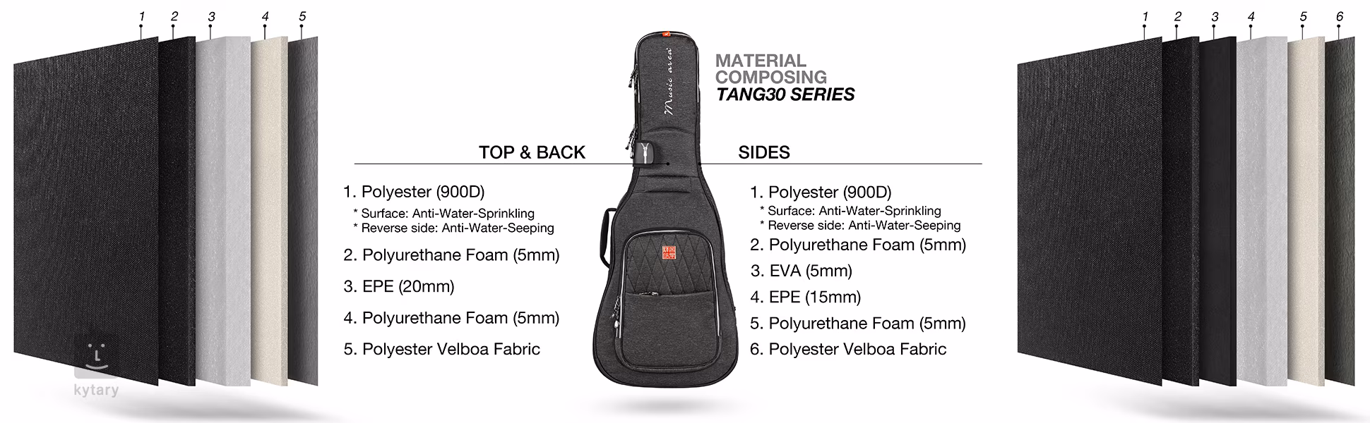 Diese luxuriösen Koffer der TANG30-Serie verfügen über eine bis zu 30 mm dicke, extrasteife Polsterung aus geschichtetem EPE- und Polyurethanschaum, die extrem leicht ist und Ihr Instrument zuverlässig vor Stößen schützt. Die Außenseite besteht aus wasserdichtem und robustem 900D-Polyester, das reißfest ist, während die Innenseite mit einer dicken Schicht aus weichem Stoff überzogen und wasserfest ausgerüstet ist. Auf der Unterseite befindet sich eine robuste PVC-Verstärkung, die nicht nur das Werkzeug, sondern auch die Tasche selbst vor Abnutzung schützt. Dieses Modell verfügt außerdem über eine abnehmbare Schutzpolsterung für die Gurtrolle und eine verstärkte, verstellbare Nackenstütze mit Befestigungssystem. Auch um die Qualität der Reißverschlüsse brauchen Sie sich keine Sorgen zu machen, denn sie werden vom Hersteller regelmäßig getestet und halten problemlos über 8.000 Auf- und Abschlüsse aus.