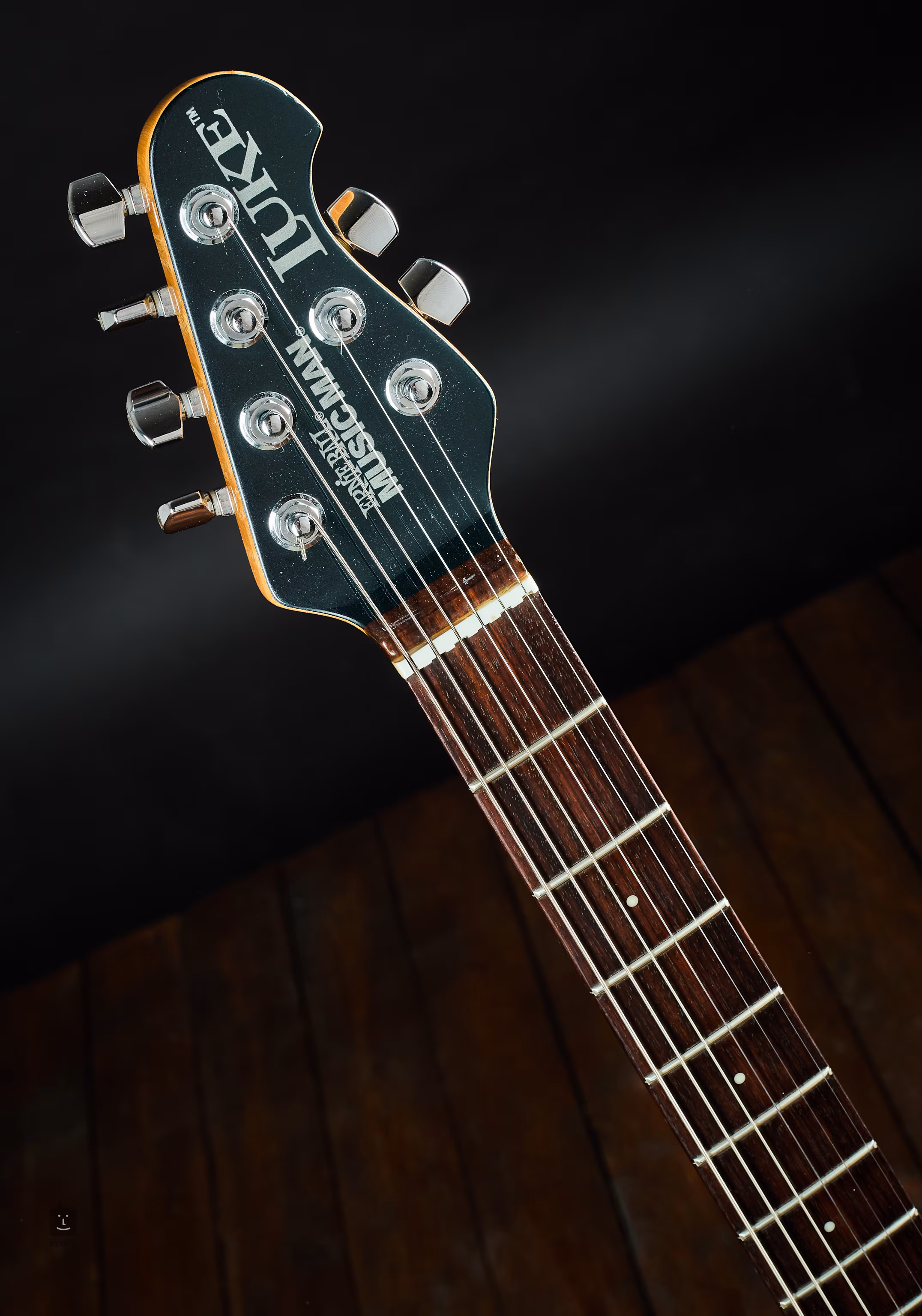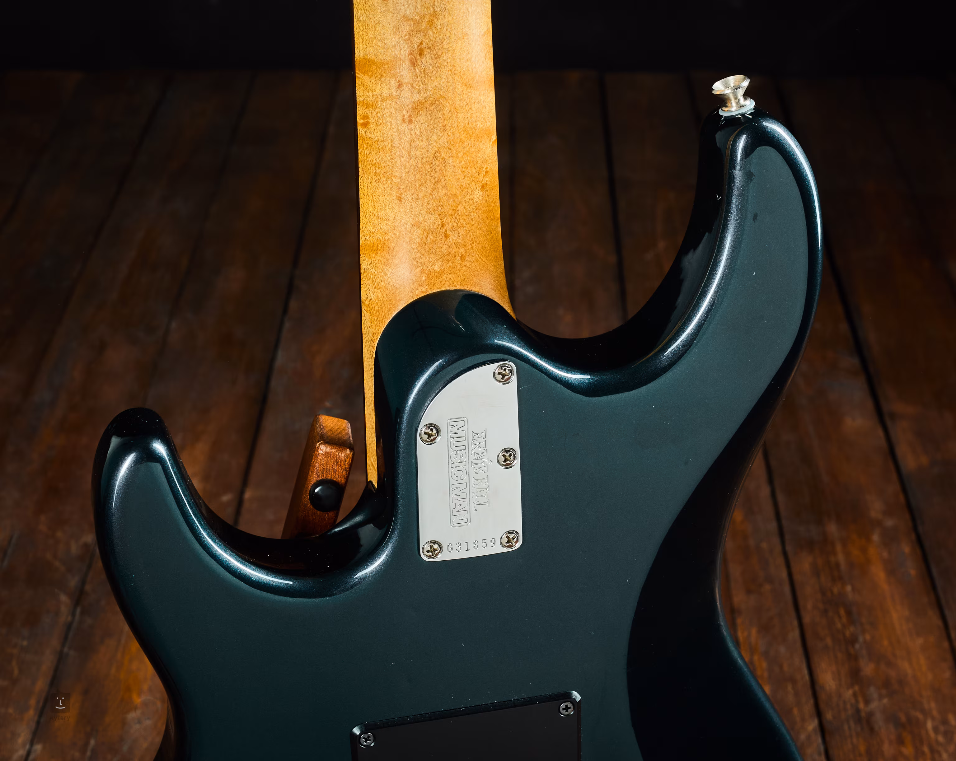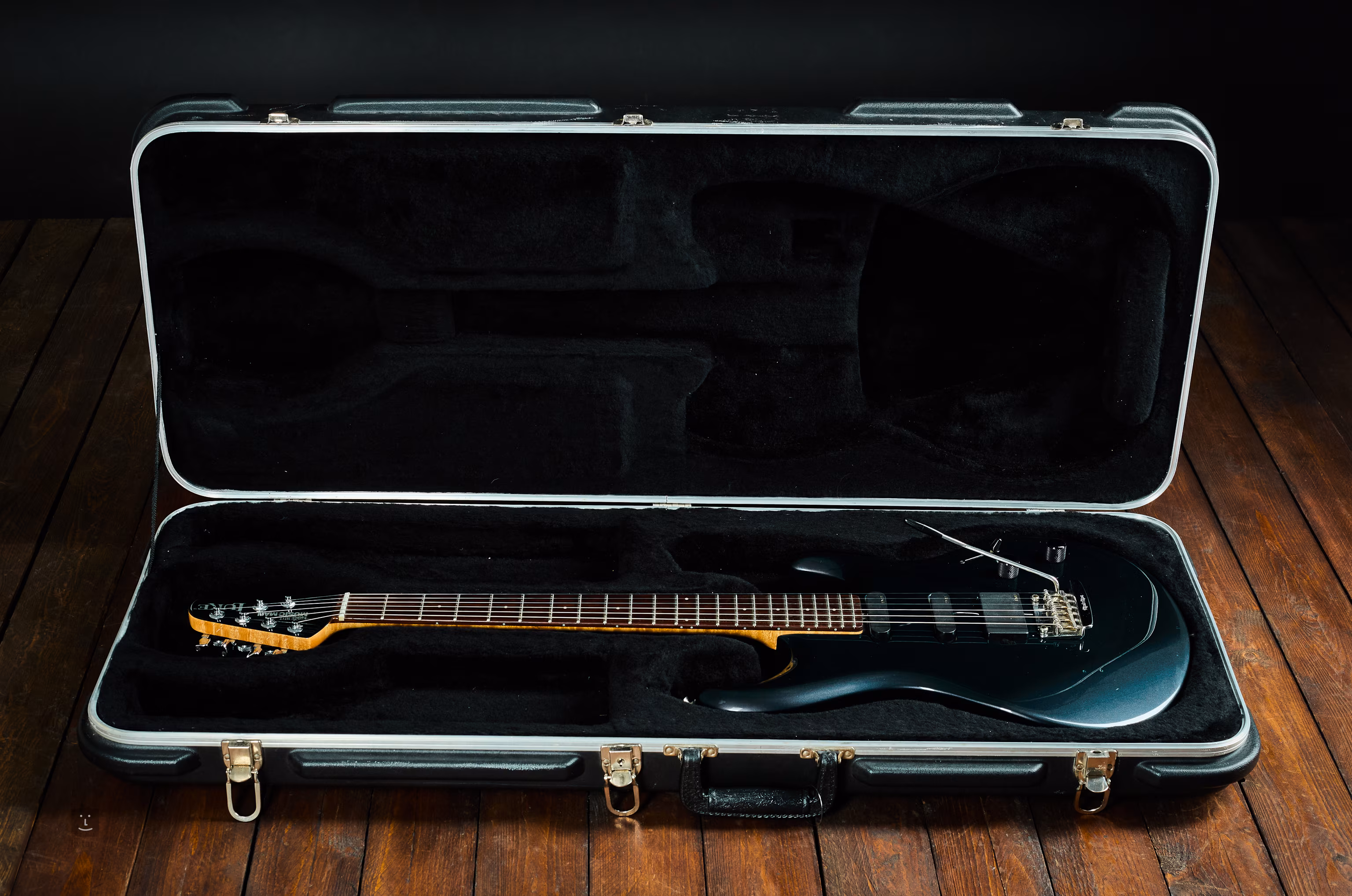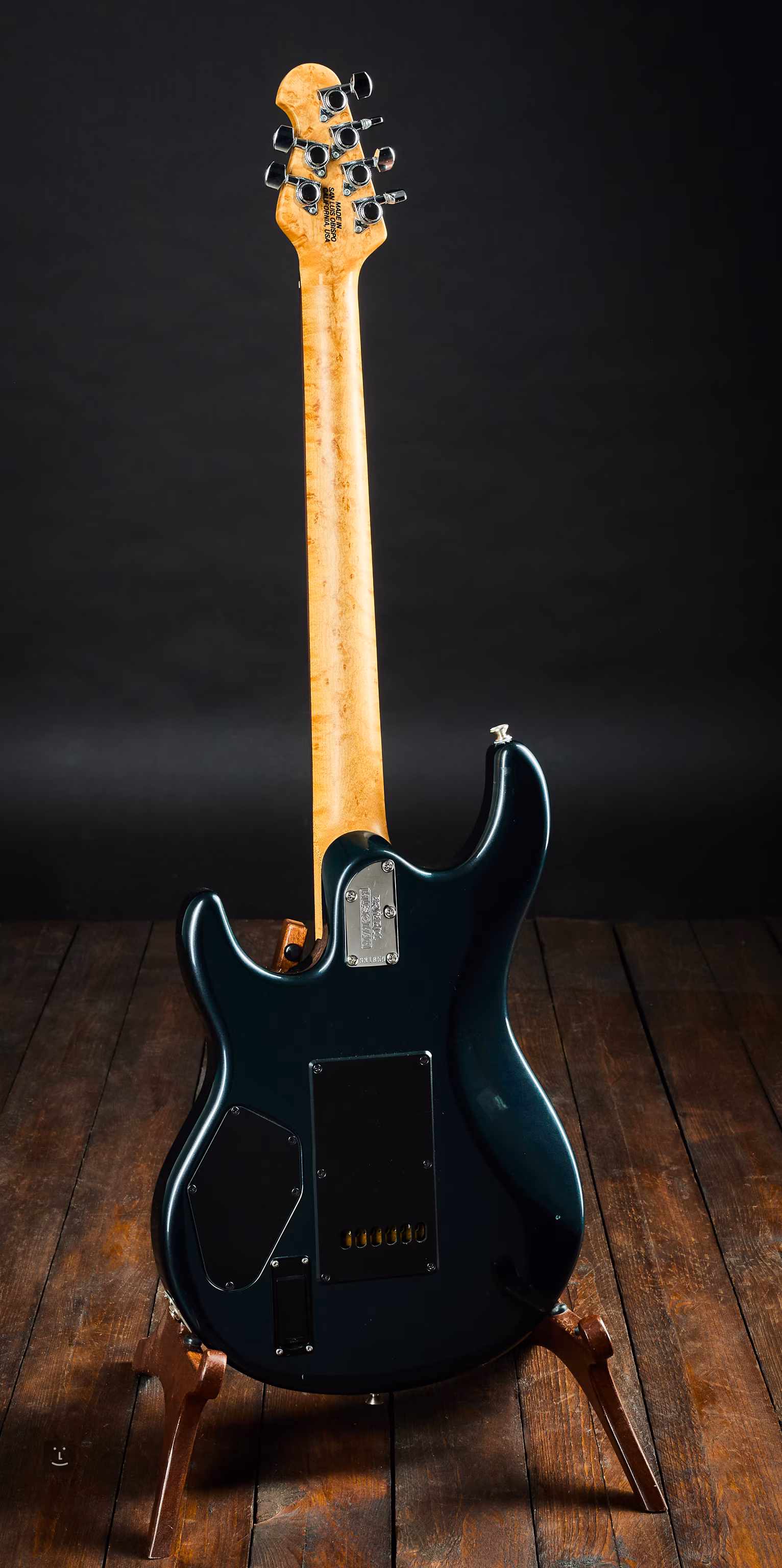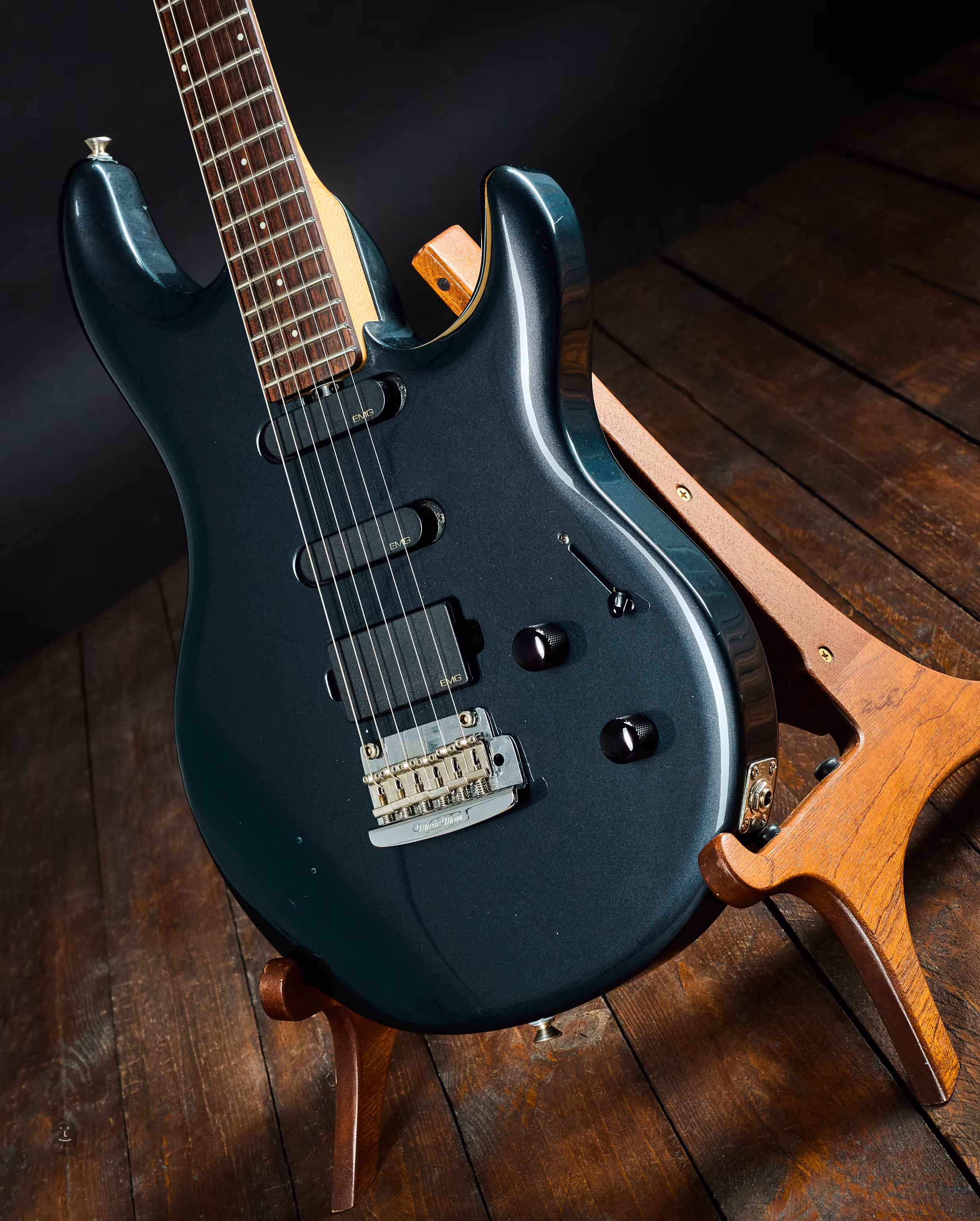 Die Pickups sind werkseitig eingebaute EMG-SLV am Hals und in der Mitte; der Humbucker ist ein EMG-85 am Hals. Die Stimmmechaniken sind feststellbar. Die Hölzer sind eine altehrwürdige Kombination aus Erle für den Korpus, Ahorn für den Hals und Palisander für das Griffbrett.
