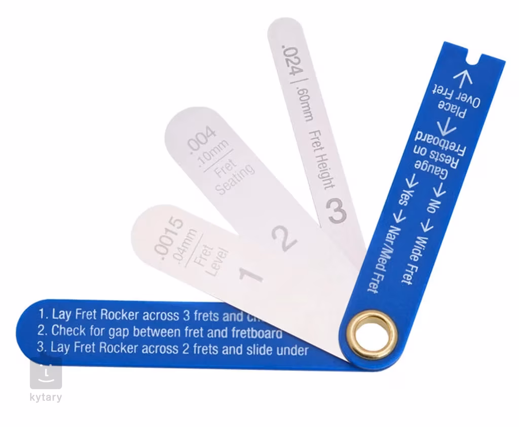 Eine Reihe von Werkzeugen zum Einstellen von Bünden und zur Diagnose von Spielproblemen. Enthält einen Satz von Metallmessern, mit denen Sie feststellen können, ob der Bund richtig sitzt, ob er hoch genug ist, ob die Bünde ausgerichtet sind und welche Feile Sie für die endgültige Bombierung des Bundes verwenden sollten. Außerdem ist ein Lineal enthalten, um die Bünde zu nivellieren, die Saitenhöhe fein abzustimmen oder die Höhe des Tonabnehmers einzustellen.