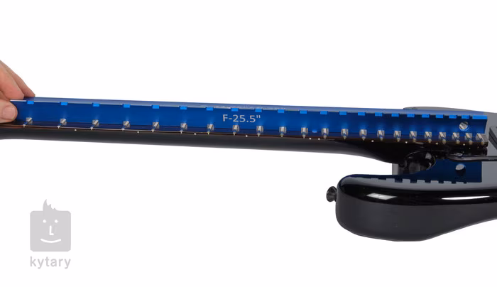 Ein dreieckiges Lineal mit Bundabständen, das für die Ausrichtung der Bünde bei handgefertigten Gitarren und zur Diagnose von Spielproblemen entwickelt wurde. Zwei der drei Kanten des Lineals sind für unterschiedliche Bundlängen ausgelegt (die F-25,5-Kante eignet sich für Griffbretter von 25,34" bis 25,625" und die G-24,75/P-25-Kante für Griffbretter von 24,625" bis 25"), während die dritte Kante gerade ist und dazu dient, zu überprüfen, ob alle Bünde bündig sind.