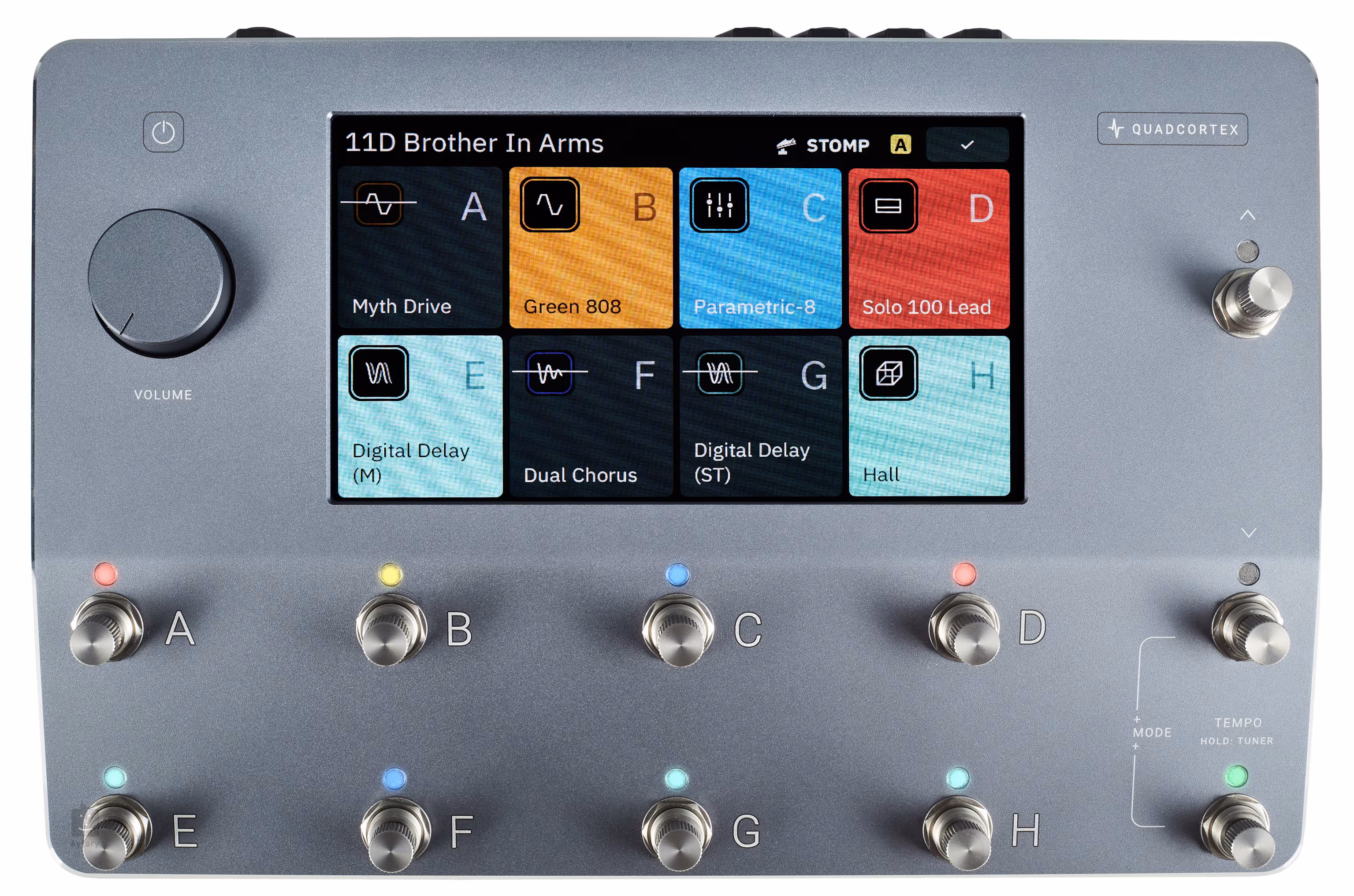 Der Neural DSP Quad Cortex ist ein leistungsstarker Floor-Modeler/Multi-Effekt für E-Gitarre/Bass mit einem 2-GHz-DSP-Prozessor (Quad-Core SHARC), einem 7-Zoll-Multi-Touch-Display und elf 2-in-1-Dual-Fußschaltern, die auch als Drehregler fungieren.