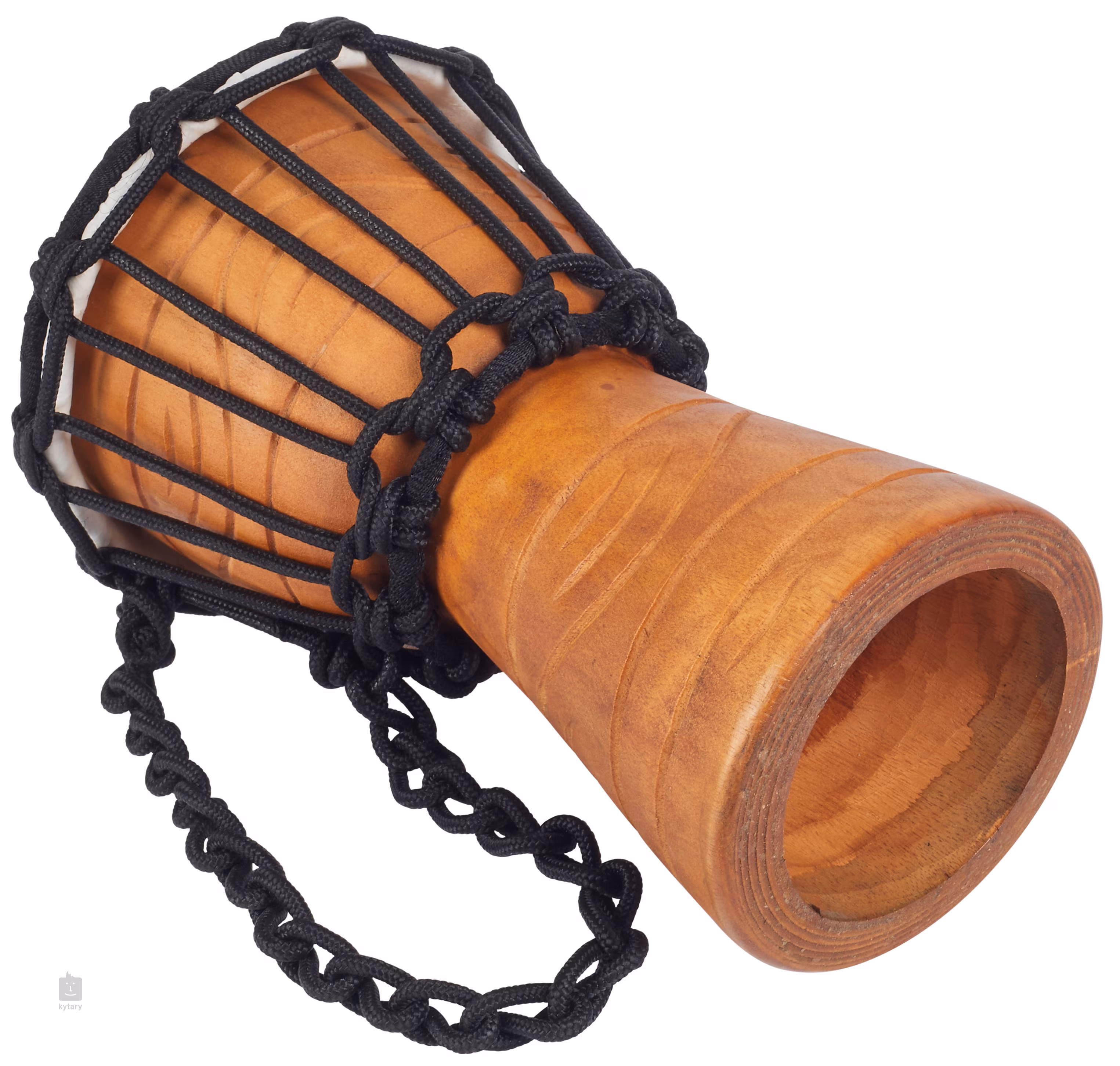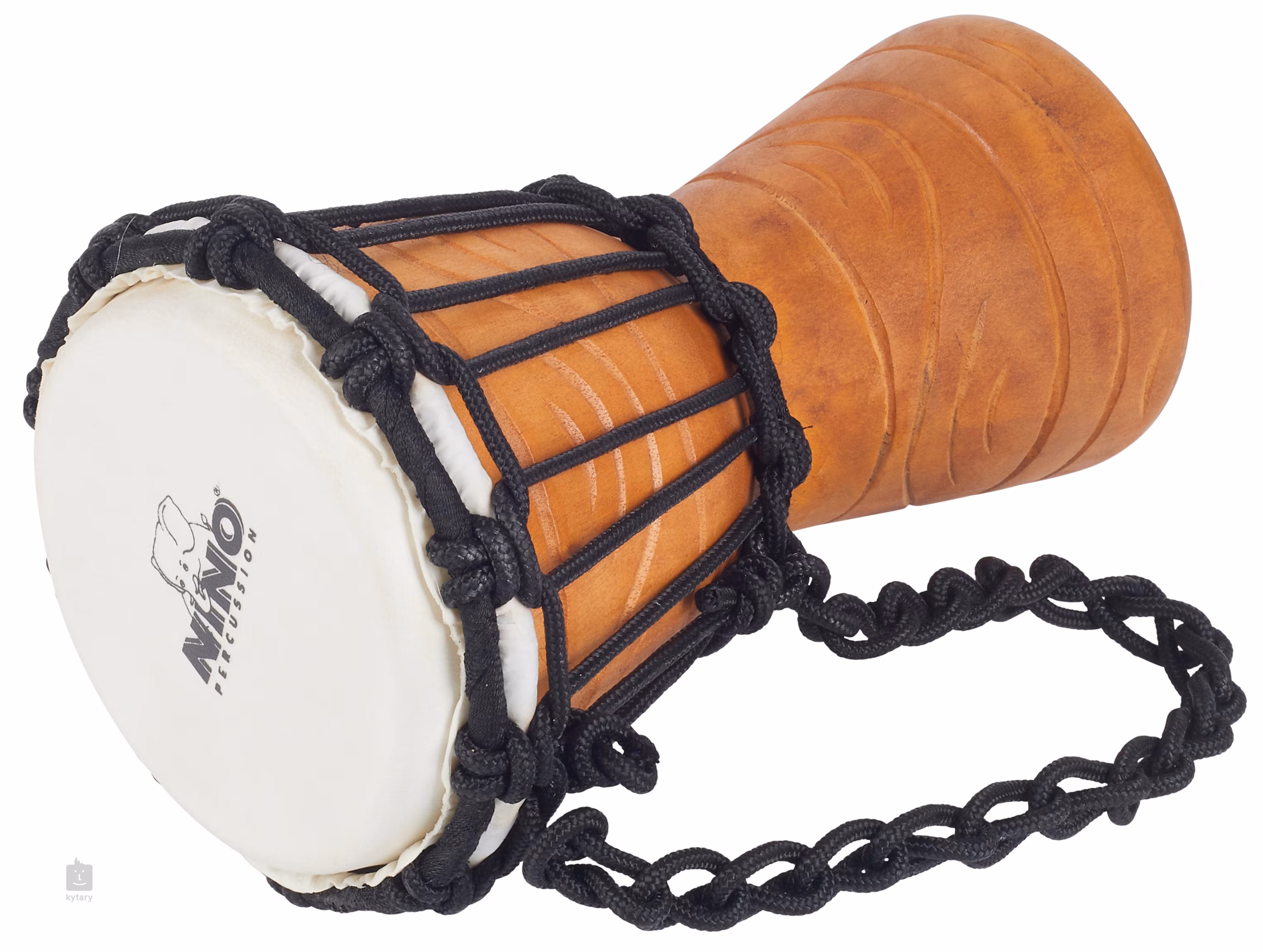 Dieses Modell basiert auf einem klassischen afrikanischen Design, der Korpus ist aus einem einzigen Stück handgeschnitztem Mahagoniholz gefertigt, für die Membran wurde handgepflücktes Ziegenleder gewählt. Ein System von Nylonseilen wird zum Stimmen verwendet. Der Durchmesser dieser Djembe beträgt 4,5 Zoll, also etwa 11,5 Zentimeter.