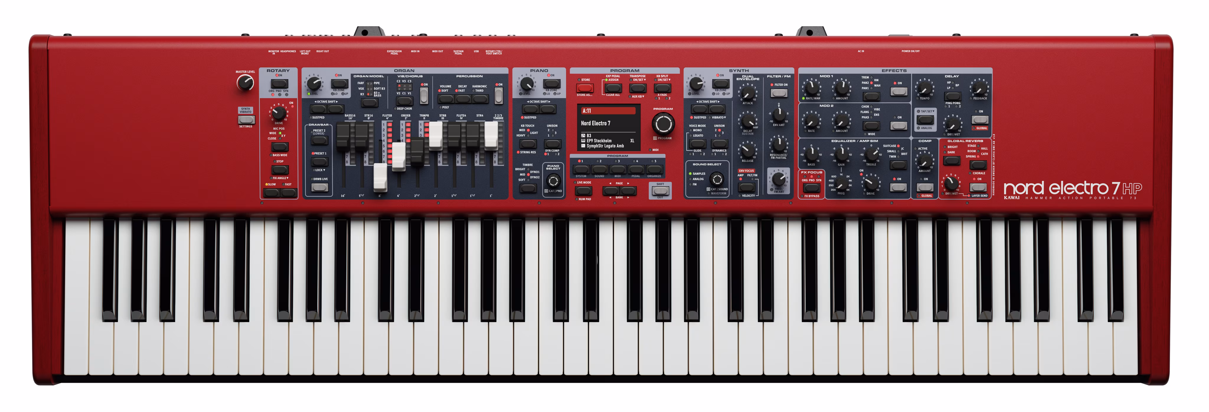 Die Orgel-Sektion ist mit den Modellen B3, B3 Bass, Vox, Farfisa, Soft B3 und Pipe Organ ausgestattet, ergänzt durch eine detaillierte Rotary-Speaker-Emulation mit drei wählbaren Mikrofonpositionen. Die Klaviatur ist vollständig kompatibel mit der Nord Piano Library, die Ihnen Zugriff auf eine ganze Reihe professioneller Klavierklänge bietet, und verfügt über moderne Funktionen wie Dynamic Compression, Unison und Timbre für maximale Ausdruckskraft und Dynamik.