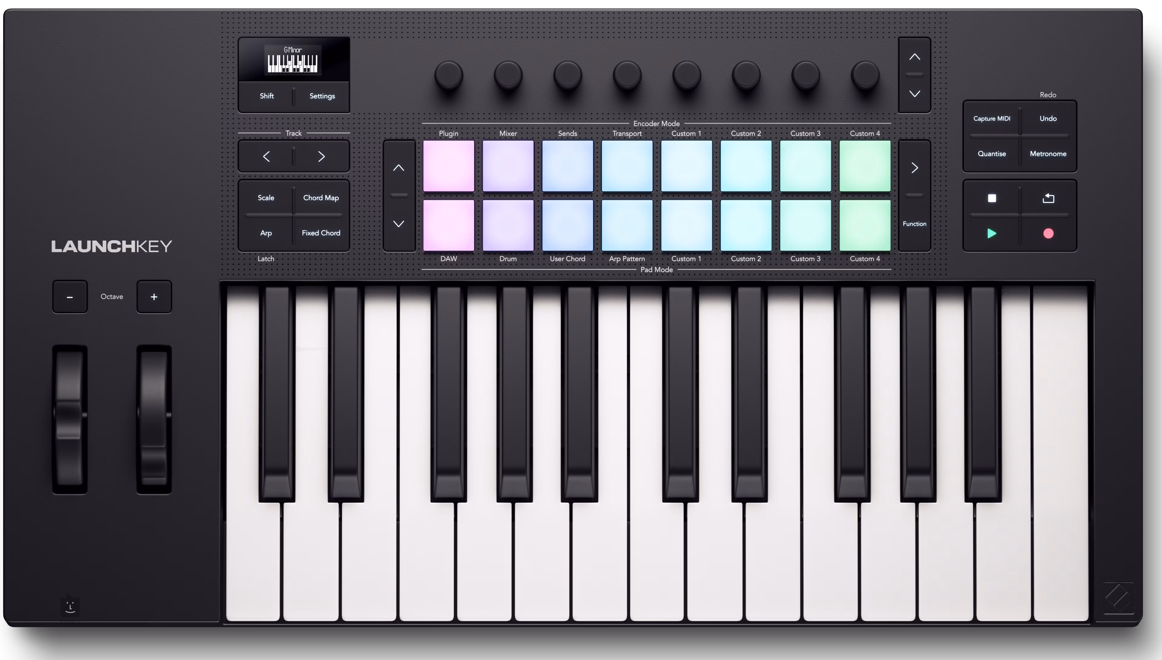 Die 16 dynamisch reagierenden Pads verfügen über polyphonen Aftertouch zum Spielen von Drums und Instrumenten sowie zum Starten von Clips. Im Gegensatz zu Standard-Pads verfügt jedes Launchkeys über einen einzigartigen radialen Tonabnehmer, der die Empfindlichkeit erhöht und die Konsistenz für noch bessere Performances verbessert.