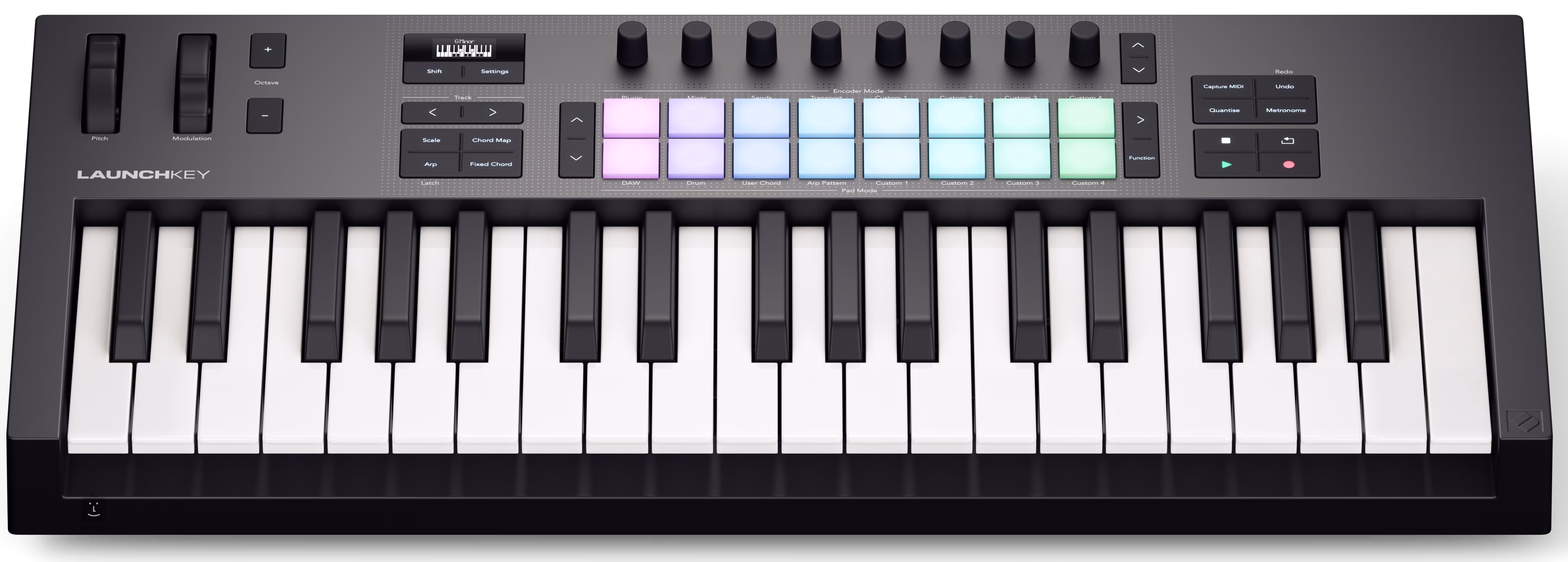 Der Novation Launchkey 37 ist ein leistungsstarker DAW-Controller mit einer Synth-Tastatur, acht stufenlosen Encodern und 16 drucksensitiven Pads für Fingerdrumming und Clip-Triggering. Der Controller verfügt außerdem über kreative Akkord- und Skalenmodi, die mit dem OLED-Display zusammenarbeiten, um das Einhalten der Tasten zu erleichtern.
