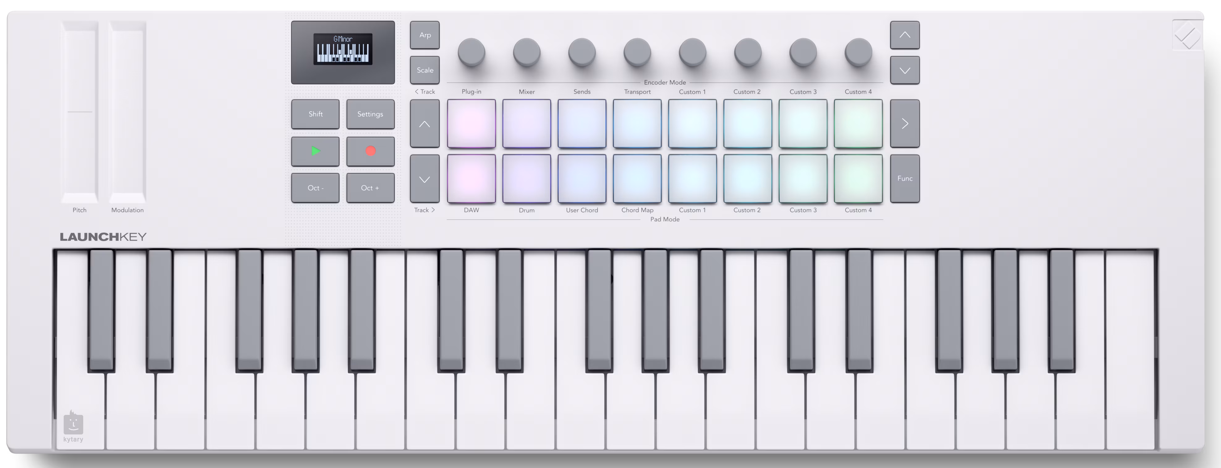 Die 16 dynamisch reagierenden Pads verfügen über polyphonen Aftertouch zum Spielen von Drums und Instrumenten sowie zum Starten von Clips. Im Gegensatz zu Standard-Pads verfügt jedes Launchkeys über einen einzigartigen radialen Tonabnehmer, der die Empfindlichkeit erhöht und die Konsistenz für eine noch bessere Performance verbessert.