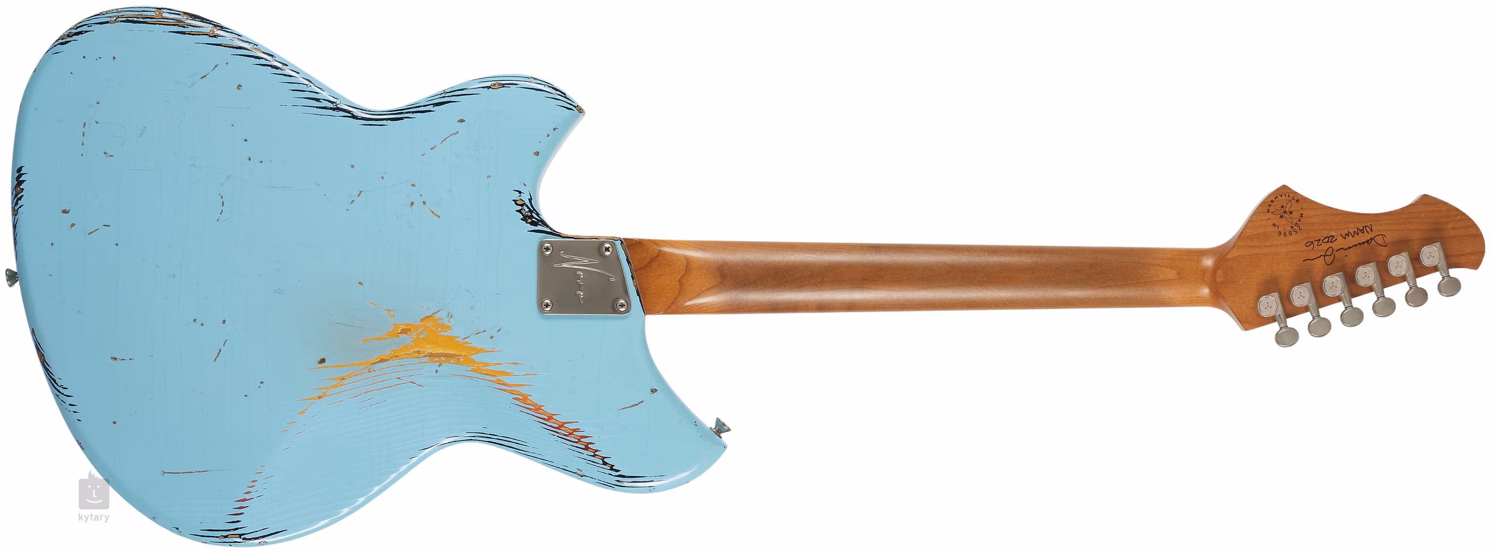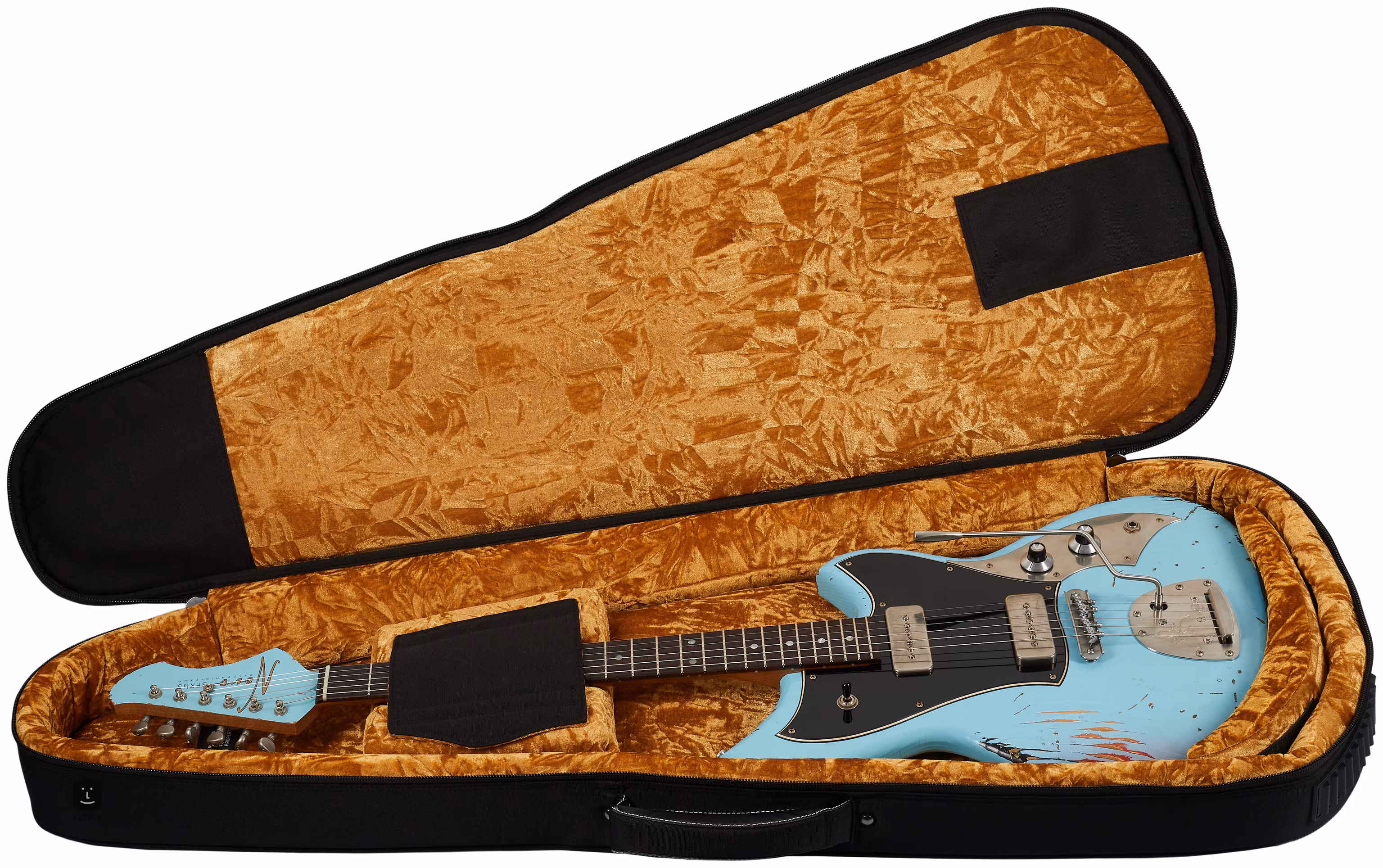 Es handelt sich um eine E-Gitarre mit einem Korpus aus Kiefernholz im Offset-Design der Serus-Modelle, die in amerikanischen Werkstätten von einem kleinen Team erfahrener Gitarrenbauer gefertigt wurde. Der Korpus ist mit einem Daphne Blue over '64 3-Tone Burst verziert, wobei unter dem blauen Lack die Grundfarbe '64 3-Tone Burst durchscheint, sowie mit einem antikisierten Finish (medium distress) und einem stilvollen schwarzen Schlagbrett. An den Ahornhals mit komfortablem Medium-C-Profil ist ein Palisandergriffbrett geklebt, das mit 22 Bünden aus Pakfong/Neusilber (.047″x.095″) besetzt ist. Das Erscheinungsbild des Halses harmoniert mit dem Vintage-Look des Korpus; durch eine thermische Behandlung hat er den Charme und das Spielgefühl von lang gereiftem Holz erhalten. Der kombinierte Griffbrettradius garantiert komfortables Akkordspiel am Sattel sowie bequemen Spielkomfort und gute Tonabnahme in den höheren Lagen des Griffbretts.