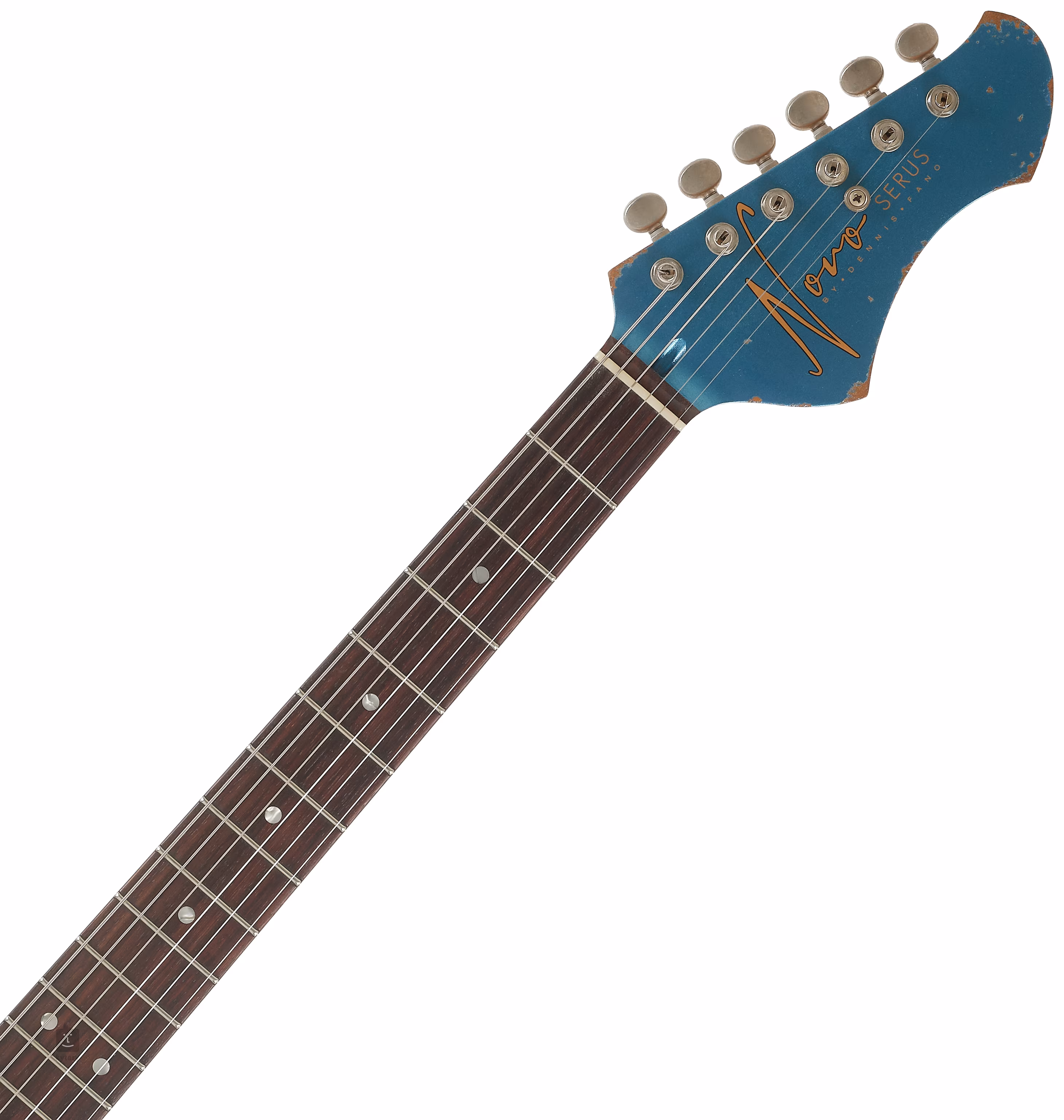 Es handelt sich um eine E-Gitarre mit einem Kiefernholz-Korpus im Offset-Design der Serus-Modelle, die in amerikanischen Werkstätten von einem kleinen Team erfahrener Gitarrenbauer hergestellt wurde. Der Korpus ist mit einem Lake Placid Blue over 64 3-Tone Sunburst-Finish verziert, wobei unter dem blauen Lack die Grundfarbe 3-Tone Sunburst durchscheint, sowie mit einem antikisierten Finish (medium distress) und einem stilvollen hellen Pickguard. Der Ahornhals mit komfortablem Medium-C-Profil ist mit einem Palisandergriffbrett mit 22 Pakfonk-/Nickel-Silber-Bünden (.047″x.095″) versehen. Der Vintage-Look des Korpus wird durch das Aussehen des Halses ergänzt, der durch eine Wärmebehandlung den Charme und das Gefühl von altem Holz erhalten hat. Der kombinierte Radius des Griffbretts garantiert ein komfortables Spielen von Akkorden am Nullbund sowie ein komfortables Spielen und Ziehen von Tönen in den höheren Lagen des Griffbretts.