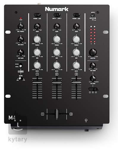 Der Numark M4 ist ein 3-Kanal-DJ-Mixer. Jeder Kanal verfügt über einen Dreiband-EQ. Zwei Plattenspieler und bis zu 4 Line-Eingänge können angeschlossen oder kombiniert werden (Phono/Line-Schalter). Es gibt einen Mikrofoneingang und einen Kopfhörerausgang.
