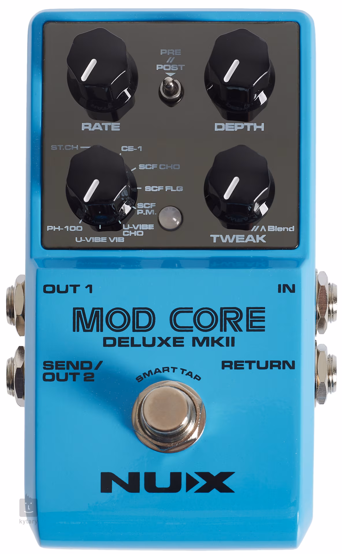 Von den acht Modulationseffekttypen stehen der vom MXR Stereo Chorus Effect inspirierte ST.CH, der auf den Eigenschaften des Boss CE-1 Chorus-Effekts basierende CE-1, die Pedaleffekt-Mods SCF CHO (Chorus), SCF FLG (Flanger) und SCF P.M. (Chorus + Pitch Vibrato Kombination) des TC Electronic Stereo Chorus Flanger, der U-VIBE Chorus- und Vibrato-Pedaleffekt des Dunlop Uni-Vibe und der PH-100 Phaser (MXR PHASE 100) zur Auswahl. Die übrigen Regler bestimmen die Geschwindigkeit und die Tiefe der Effektmodulation sowie das Verhältnis zwischen trockenem und nassem Signal. Im Alt/Parallel-Modus hat der Tweak-Regler eine Blend-Funktion, d. h. er bestimmt das Verhältnis von Wet-Signal-Mod-Effekten und Effekt-Loop.