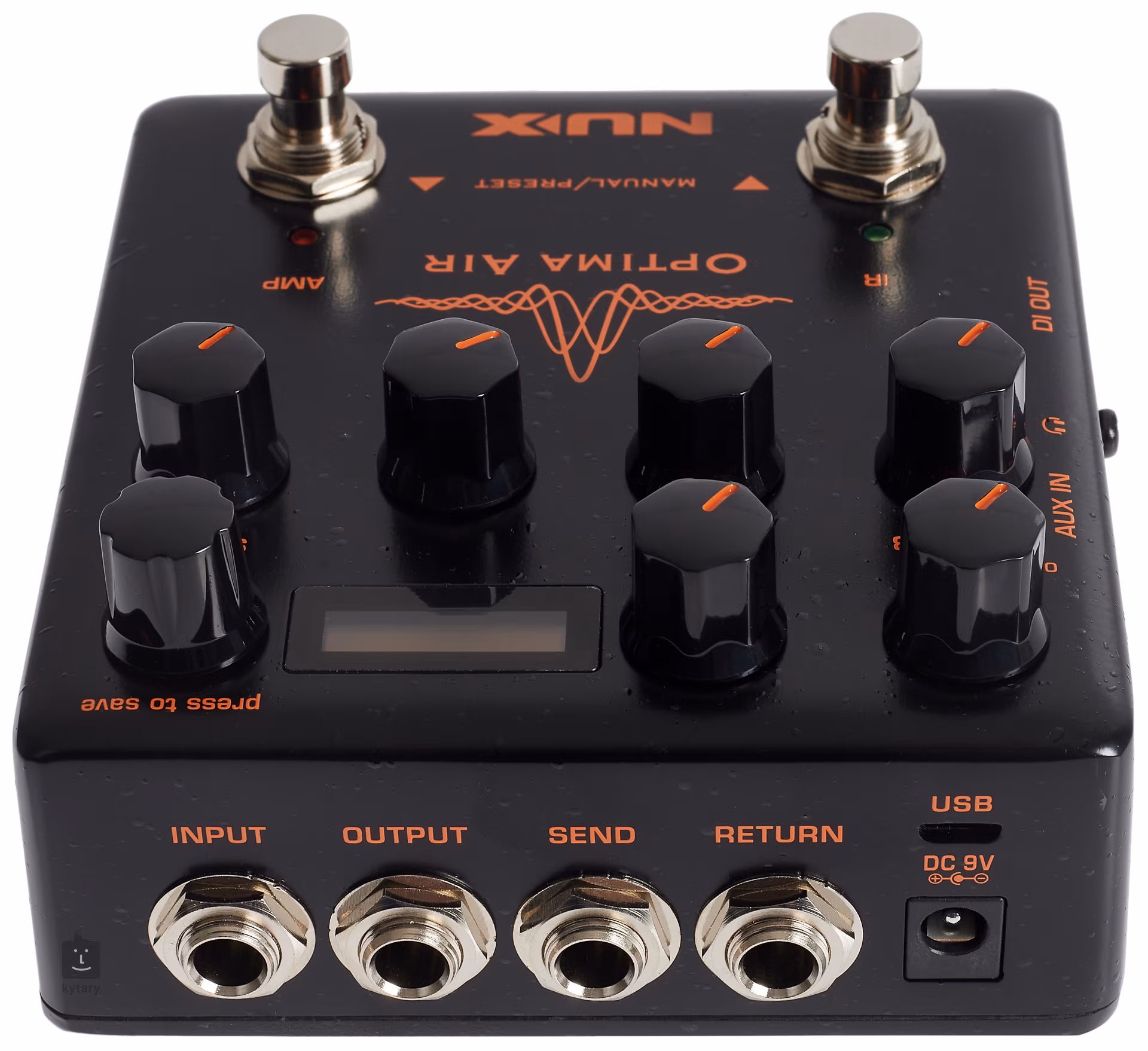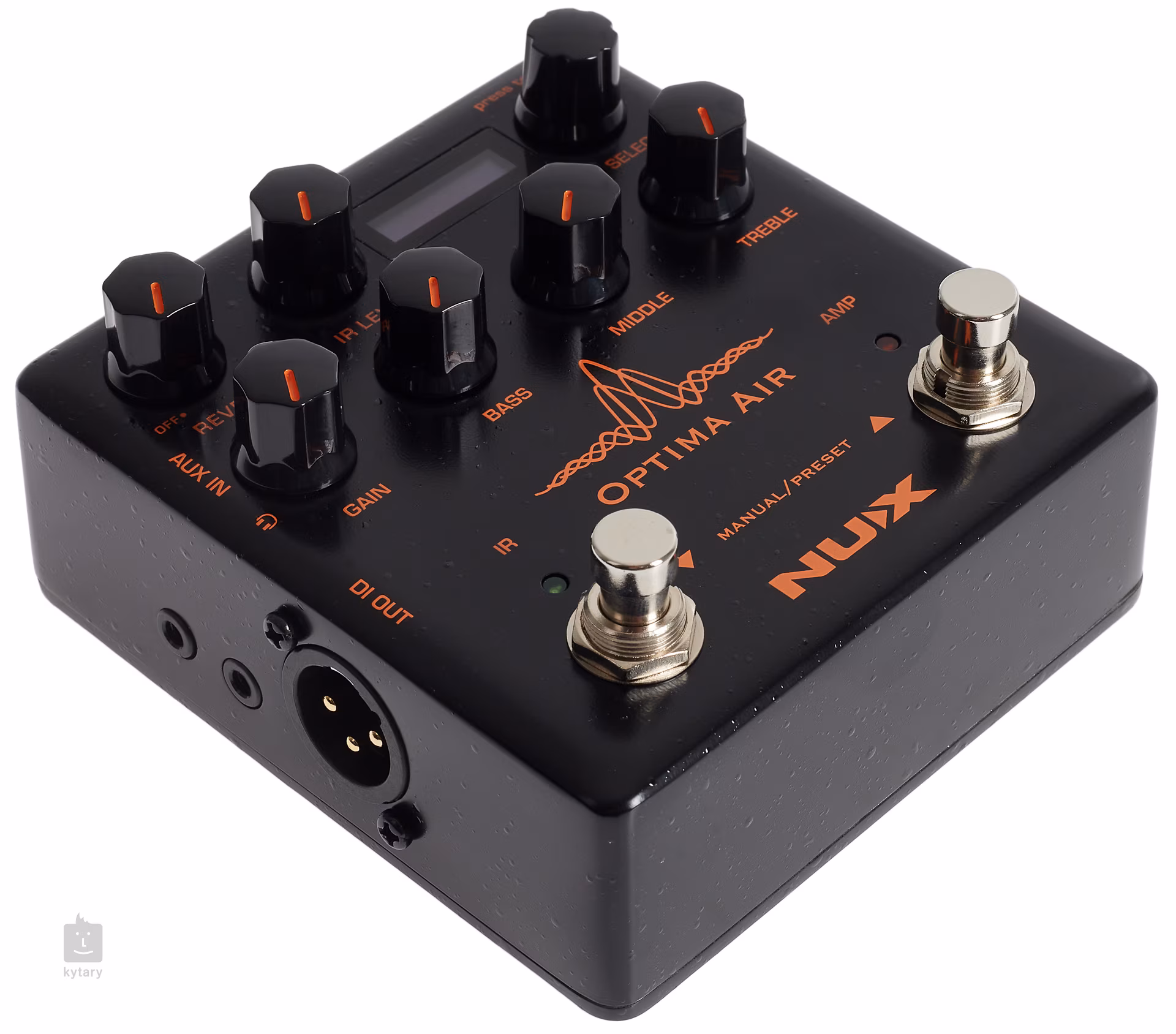Das NUX Optima Air ist ein Akustiksimulator, Vorverstärker und IR-Loader mit Dreiband-EQ, Gain-Regler, eingebautem Hall und Effektschleife für die einfache Integration Ihrer bevorzugten Gitarreneffekte. Die Box arbeitet in zwei Modi (Manuell und Preset) und bietet 15 Impulsantwort-Gitarren (IR) bekannter Marken, die für bestimmte Gitarrentypen (akustisch, elektrisch) und Tonabnehmer optimiert sind, sowie die Möglichkeit, benutzerdefinierte Profile/IR aufzunehmen, neun Steckplätze für Benutzer-Presets, einen XLR-DI-Ausgang für den Anschluss an ein Mischpult oder eine PA und einen Micro-USB-B-Anschluss für die Verbindung mit der Optima Air-Bearbeitungssoftware zum Erstellen, Bearbeiten und Speichern Ihrer Presets.