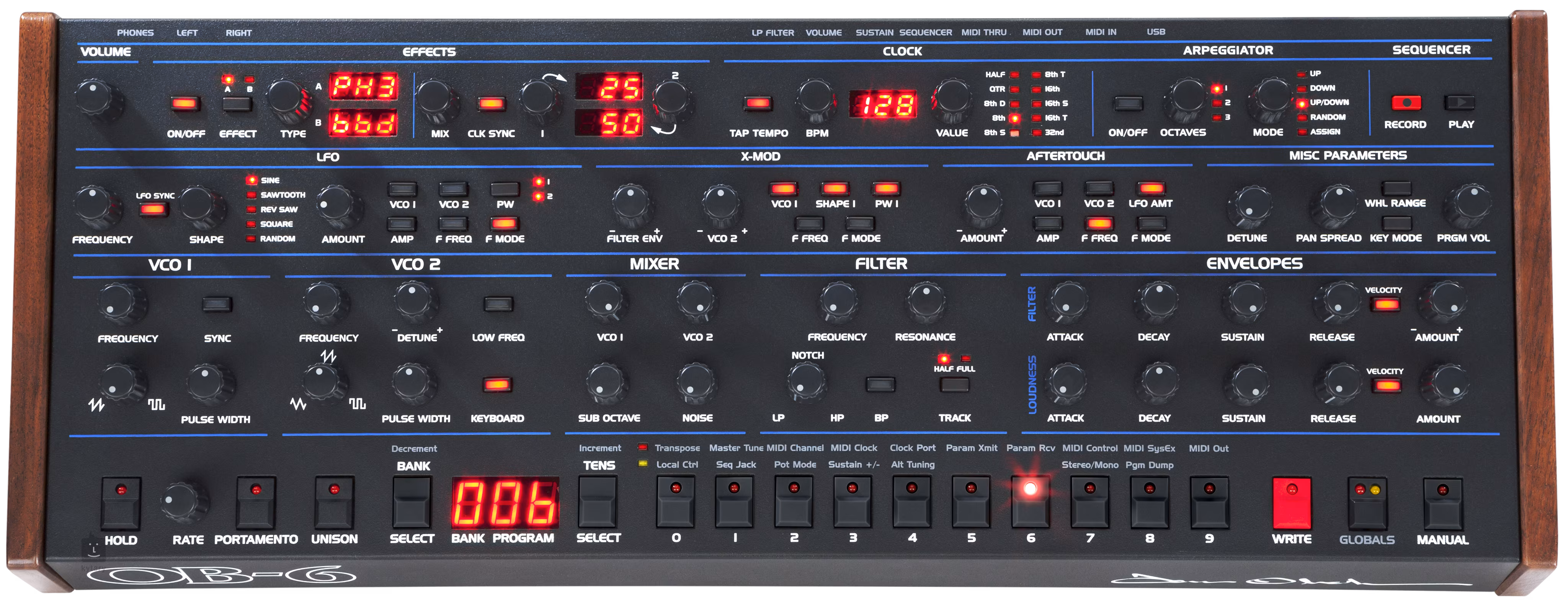 Alle Funktionen des OB-6 lassen sich über das Frontpanel steuern, wobei 500 werkseitige Presets und weitere 500 vom Benutzer veränderbare Speicherplätze zur Verfügung stehen.