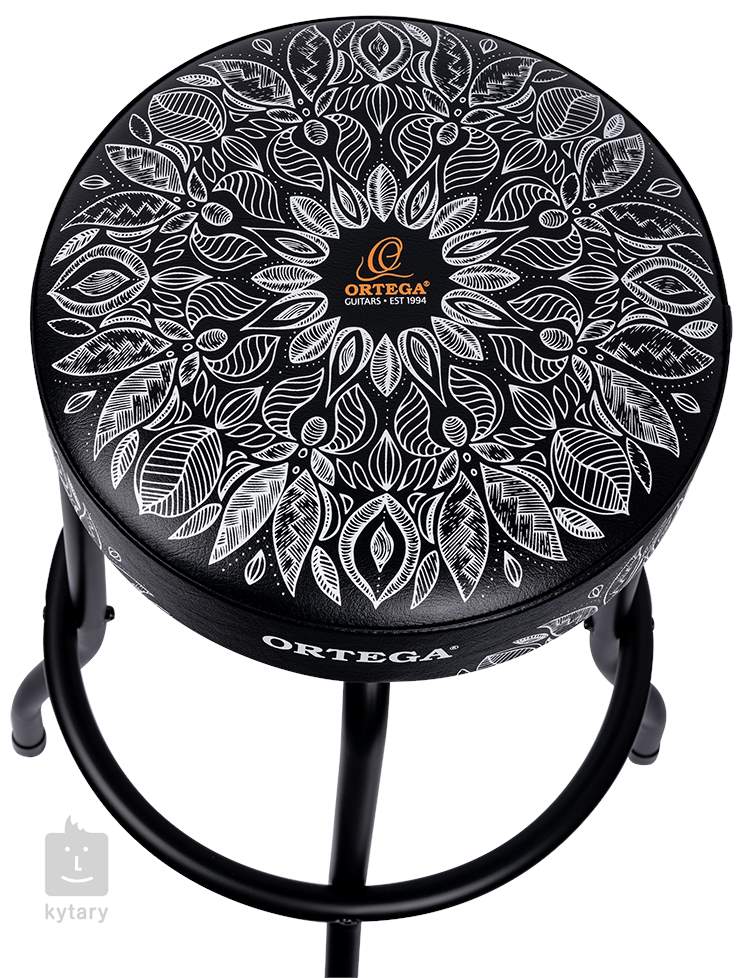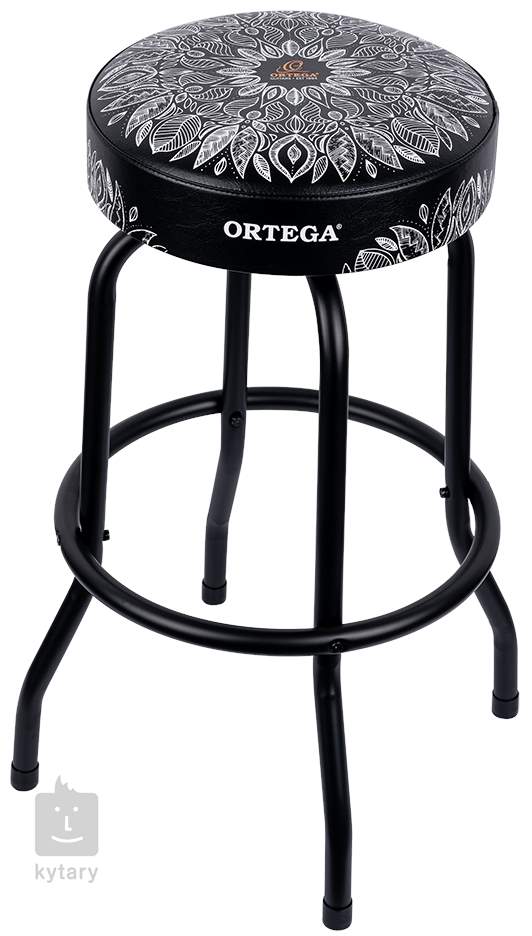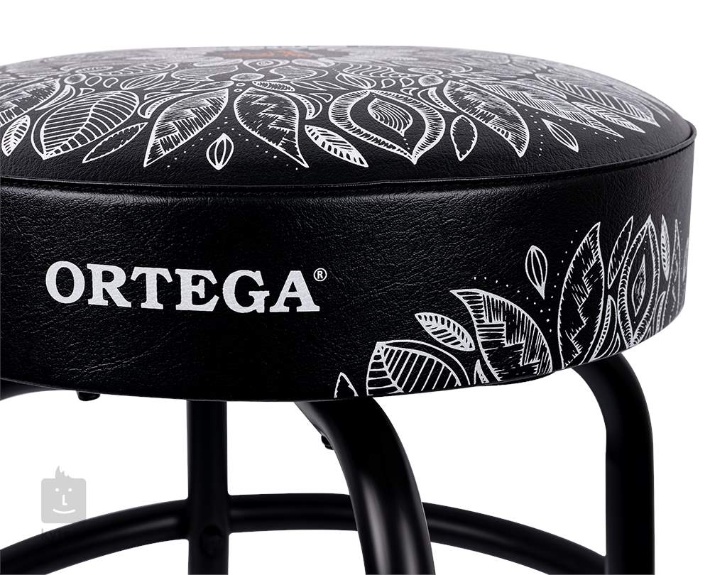 Bequemer Gitarrenhocker von Ortega mit einem Metallgestell, auf dem ein frei drehbarer Sitz mit dicker Polsterung sitzt. Zusammen mit der Fußstütze aus Metall sorgt der Hocker für bequemes Spielen, egal ob auf der Bühne, im Proberaum oder zu Hause.