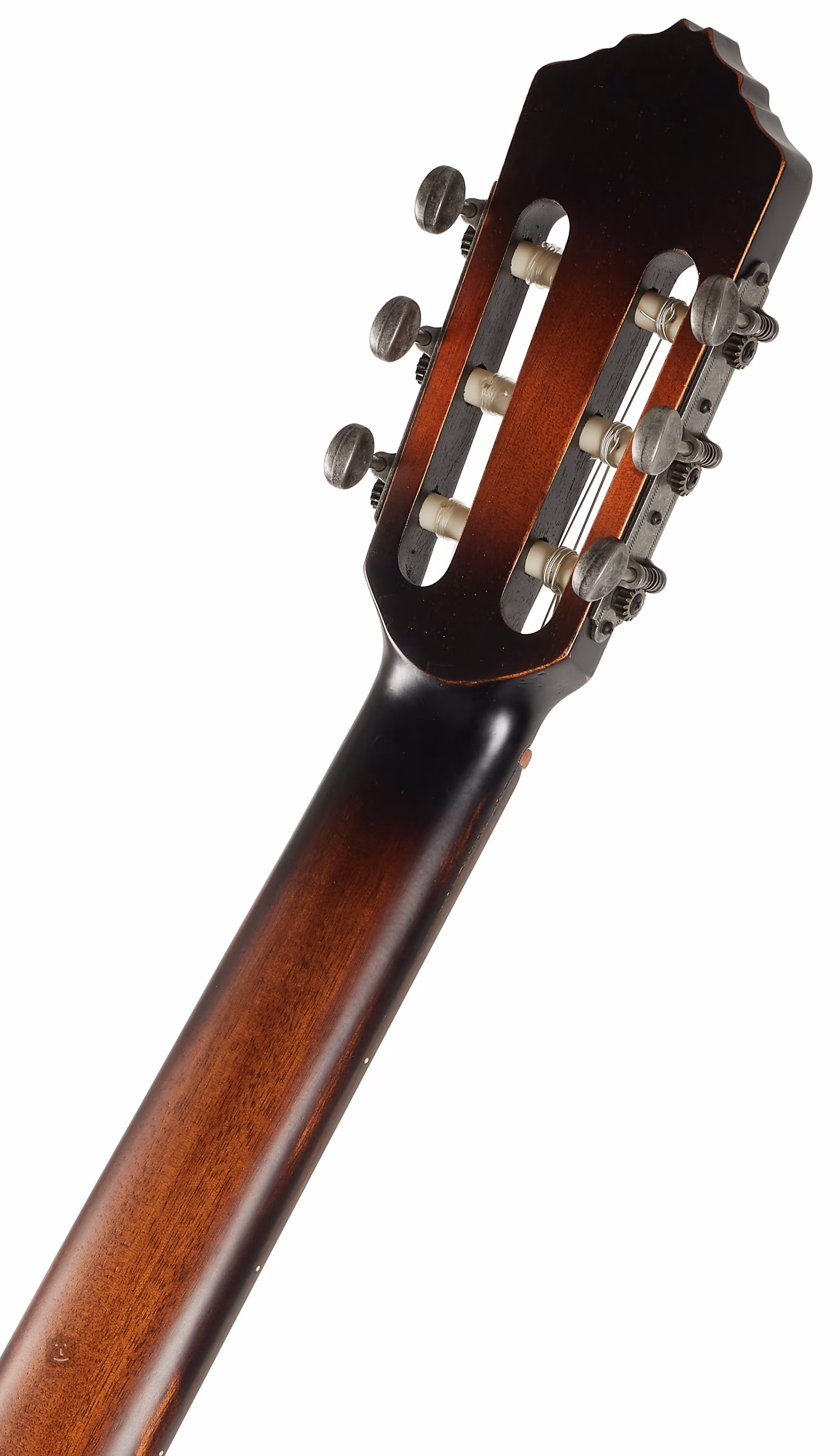 Schon auf den ersten Blick fällt das Instrument durch sein beeindruckendes Distressed Finish auf. Die Vorderseite der Gitarre ist aus massiver Sitka-Fichte gefertigt, Boden und Zargen aus Mahagoni. Der Korpus des Instruments ist offenporig lackiert. Der Mahagoni-Hals mit Zwei-Wege-Bracing ist mit einem Griffbrett aus Schwarzholz ausgestattet. Die Saiten werden von Stimmmechaniken im Vintage-Stil und einem Griffbrett aus Schwarzholz gehalten. Das edle Aussehen des Instruments wird durch das Tobacco Sunburst-Finish, das Walnuss-Binding, das Grafikmotiv am 12. Bund und das Firmenlogo auf der Kopfplatte betont.