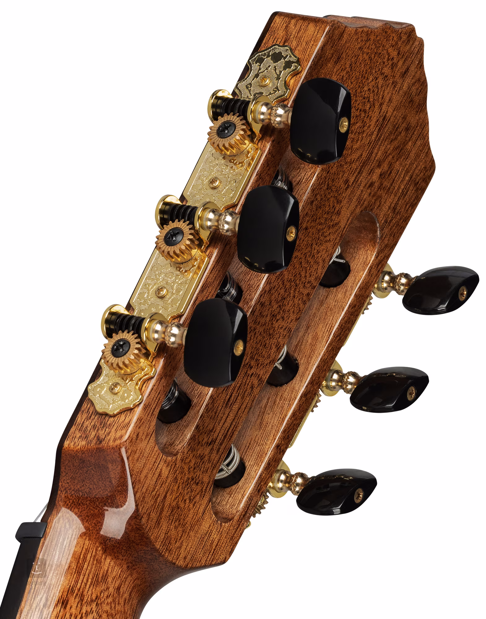 Auf den Okoumé-Hals ist ein Palisandergriffbrett mit neunzehn Bünden geleimt. Der Hals wird durch eine doppelte Verstrebung verstärkt. Die Saiten sind in den firmeneigenen Stimmmechaniken in Goldlack mit schwarzen Wirbeln und Palisandergriffbrett montiert. Die schöne Verarbeitung wird durch die praktische Armlehne, die Holzrosette und den Perlmutt-Schallboden unterstrichen.
