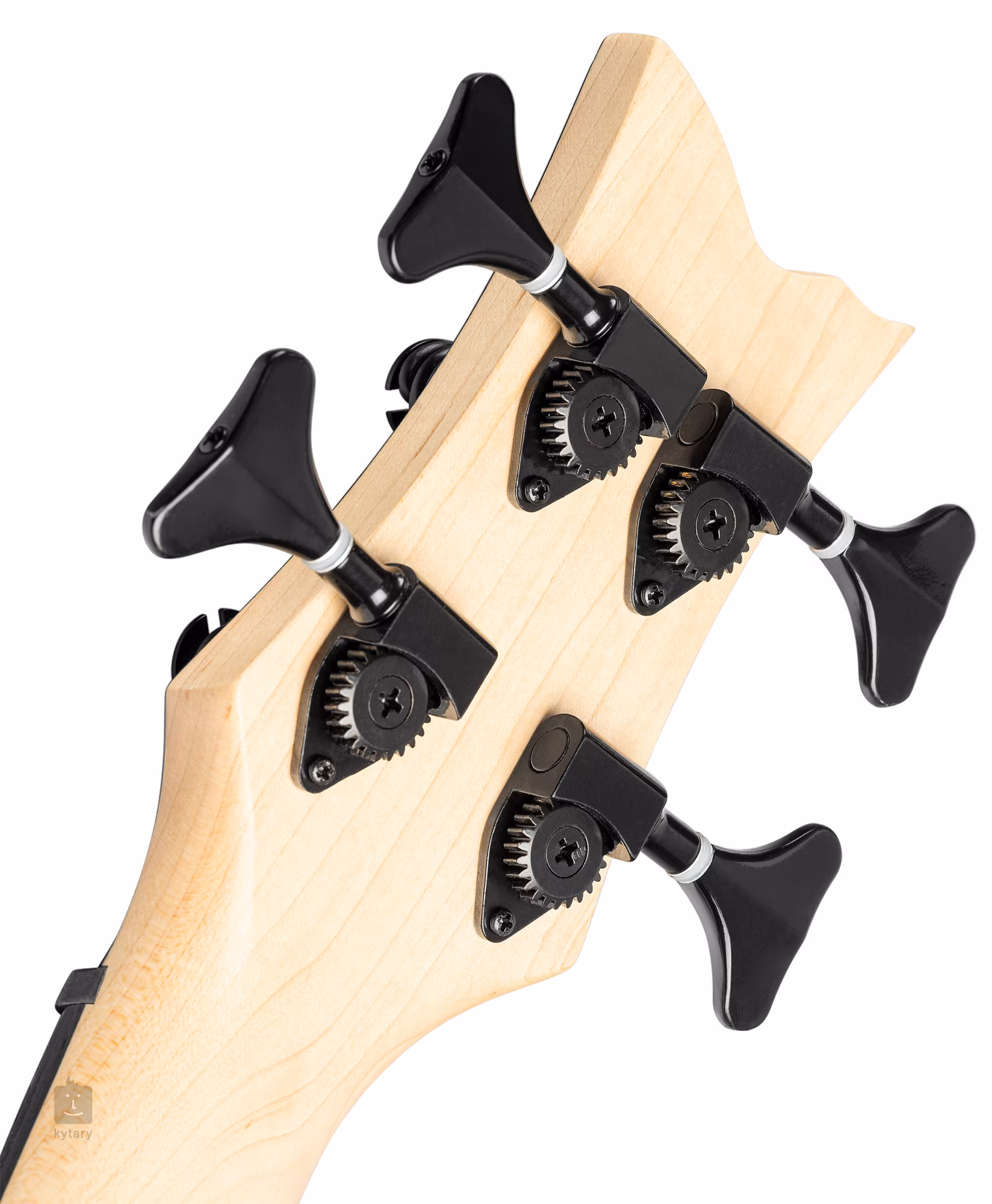 Der Korpus der Ortega Neo BS TSB Bass-Ukulele ist aus massivem Okoumé und die Decke ist aus geflammtem Ahorn gefertigt. Der gemaserte Ahorn wird durch die glänzende Lackierung und das Tobacco Sunburst Finish akzentuiert. Auf den Ahornhals ist ein Griffbrett aus Purpleheart-Holz geklebt, das mit zwanzig Bünden ausgestattet ist. Ein Cutaway im unteren Bereich des Korpus erleichtert die Nutzung des Griffbretts in den höheren Lagen.