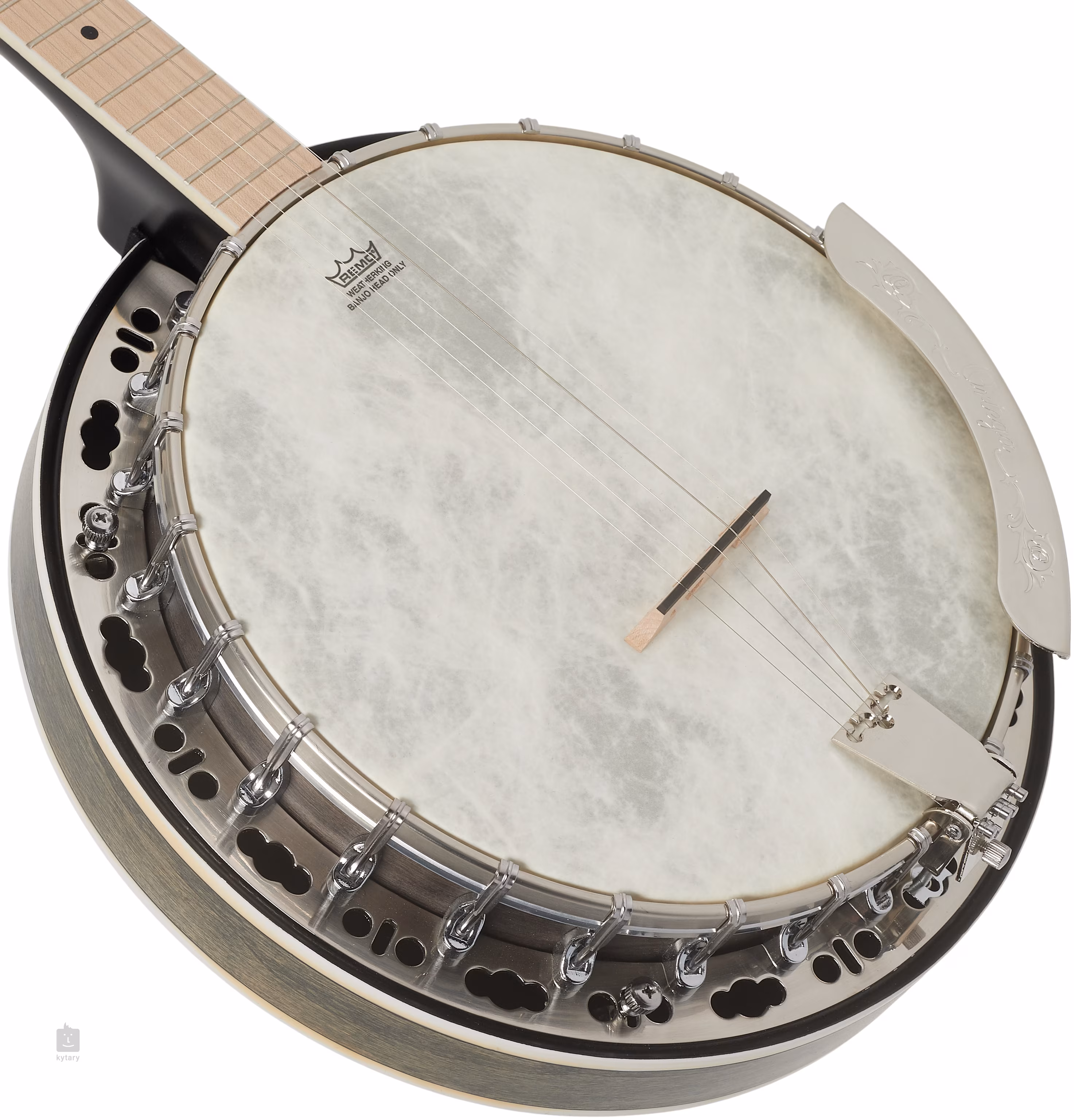 Das OBJE400TCO-L ist ein fünfsaitiges Banjo mit geschlossenem Rücken. In diesem Fall ist der Resonator aus Ahorn mit einer Holzmaserung gefertigt und mit einem Coal Black Finish versehen. Das Banjo erzeugt also nicht nur einen ausreichend kräftigen und hochwertigen Klang (das Banjo hat einen Tonring aus Messing), sondern sieht auch noch gut aus. Das Instrument bietet außerdem einen Hals und ein Griffbrett aus Ahorn, eine verchromte und mit einer Gravur versehene Armlehne, einen Korpus aus Ahorn und eine schwarze Remo-Membran, die mit einem Spannsystem befestigt ist, d.h. mit einem einteiligen Zwischenring, einem Druckring und vierundzwanzig Haken. Die Saiten sind in verchromten Die-Cast-Stimmmechaniken und in einem verchromten Saitenhalter montiert.