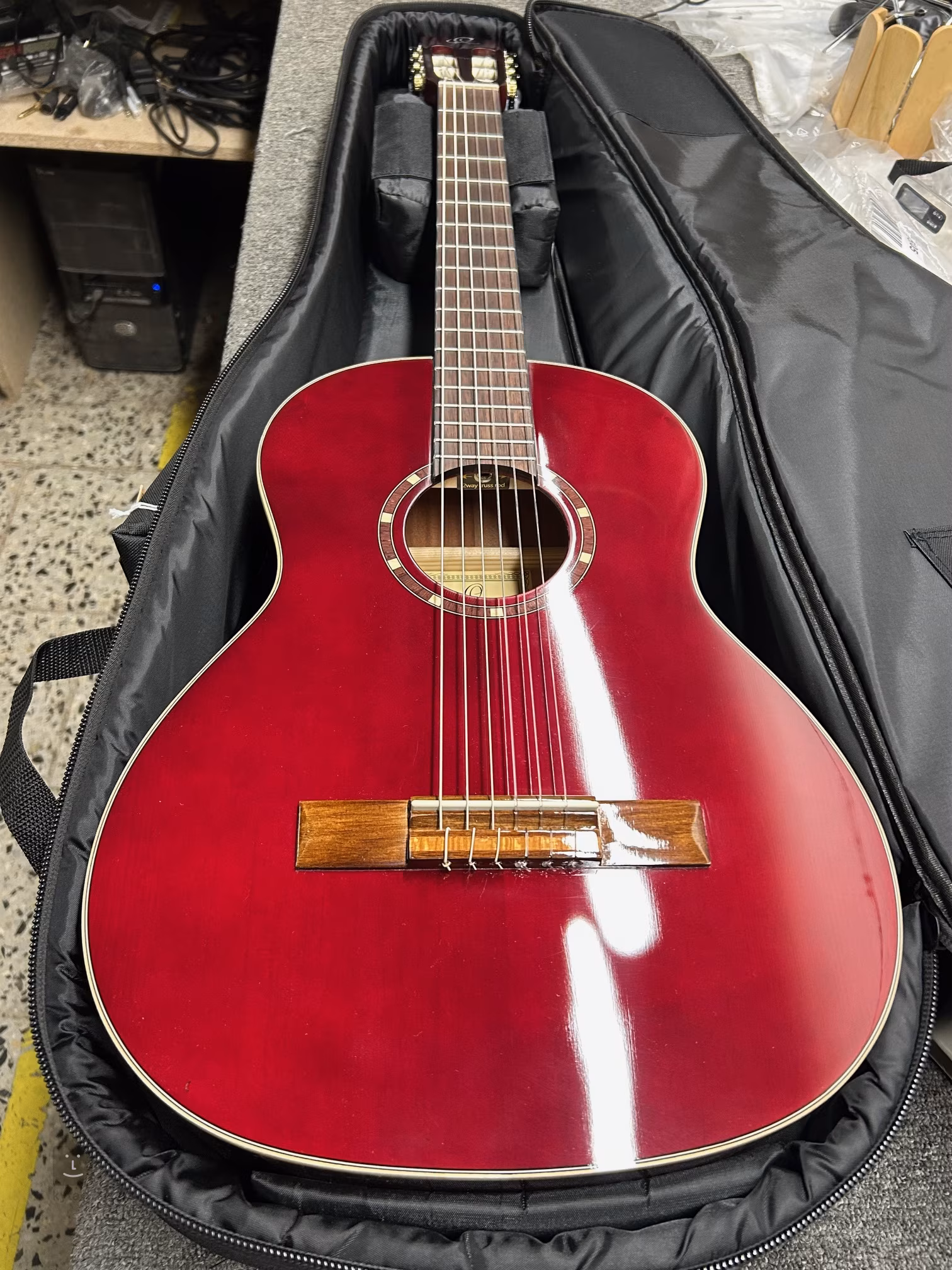 Die klassischen Gitarren der Marke Ortega aus der Family-Serie sind die ideale Wahl für Anfänger, die ein hochwertiges Instrument zu einem erschwinglichen Preis suchen. Insbesondere die Gitarren in Dreiviertelgröße, d. h. mit kleinerem Korpus, schmalerem Hals und kürzerer Mensur, eignen sich für Kinder und junge Musikschüler. Probieren Sie sie aus und überzeugen Sie sich selbst. Es handelt sich um Instrumente mit einem mehrschichtigen Korpus aus Sperrholz aus Fichte oder Zeder und Zargen und Boden aus laminiertem Mahagoni, einem massiven Mahagonihals mit zweiseitiger Verstärkung und einem Griffbrett aus Walnussholz. Die Saiten sind in klassischen offenen Mechaniken und einem Steg aus Walnussholz mit zwölf Öffnungen befestigt. Traditionelle Zierelemente sind die Einfassung, die Rosette und das Firmenlogo auf dem Kopf des Instruments. Die Gitarre wird in einer Instrumententasche (Gigbag) geliefert.