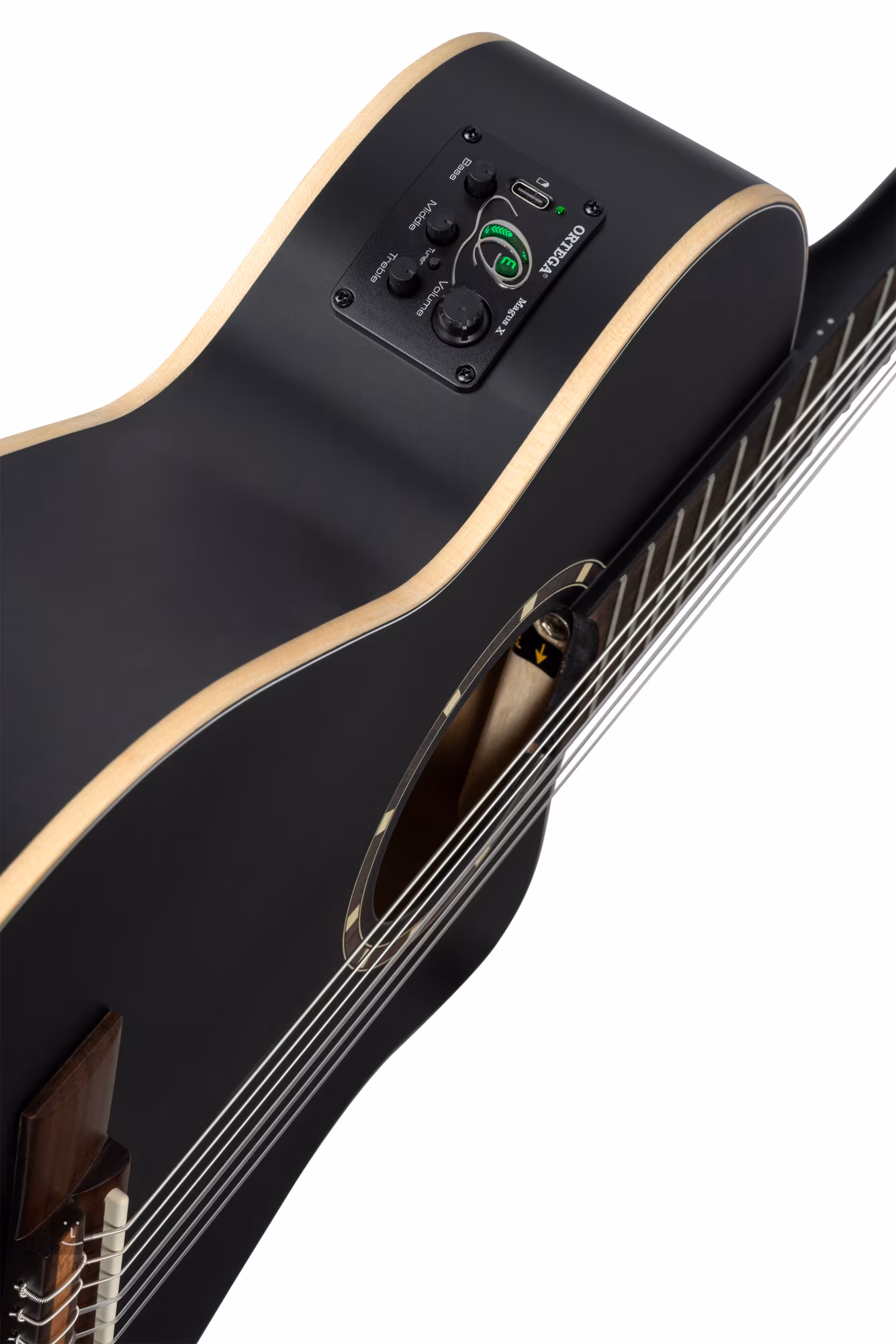 Das Soundsystem verfügt über eine Ortega MagusPro-Elektronik mit integriertem Stimmgerät, Dreiband-Equalizer, Lautstärkeregler und Phase-Taste.