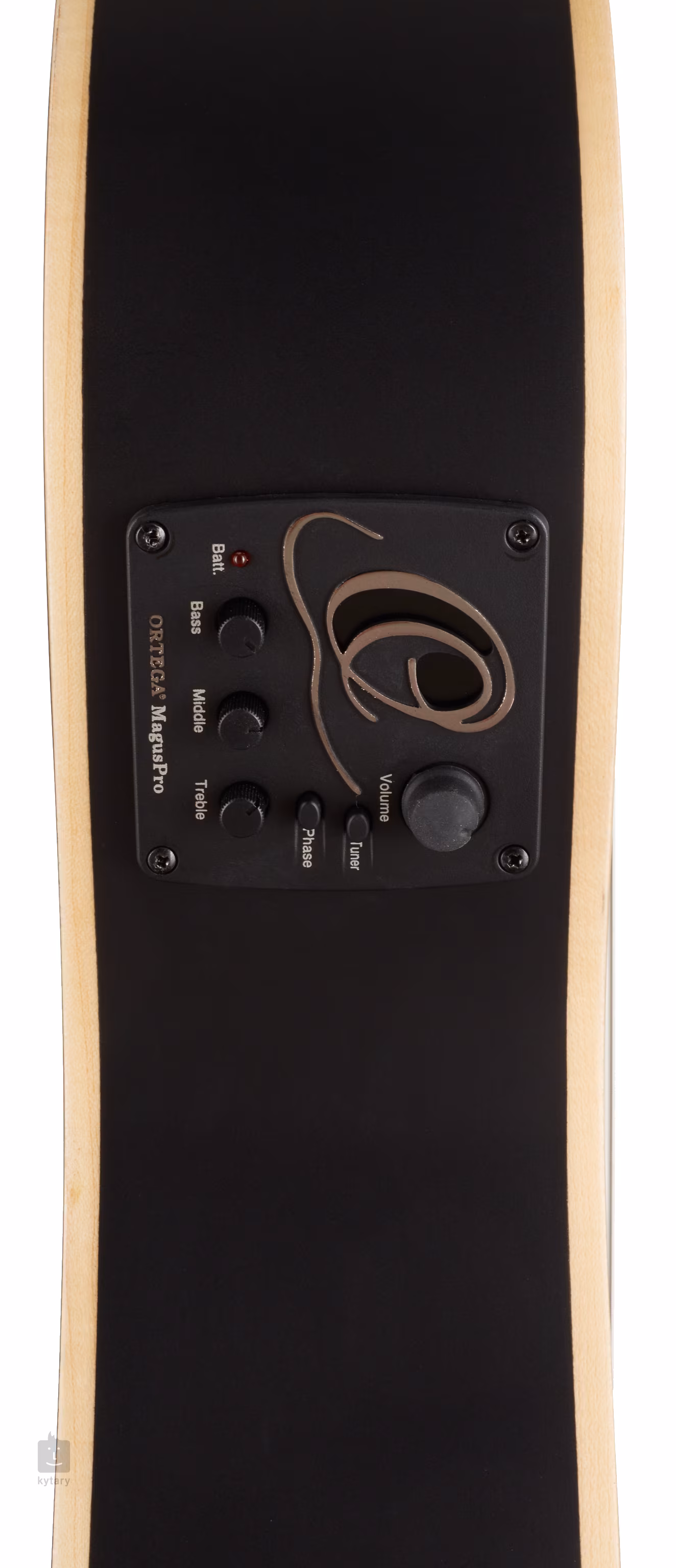 Dieses Modell ist außerdem mit der Ortega MagusPro-Elektronik mit integriertem Tuner, Dreiband-Equalizer, Lautstärkeregler und Phase-Taste mit Phasenumkehrfunktion (Rauschunterdrückung) ausgestattet.