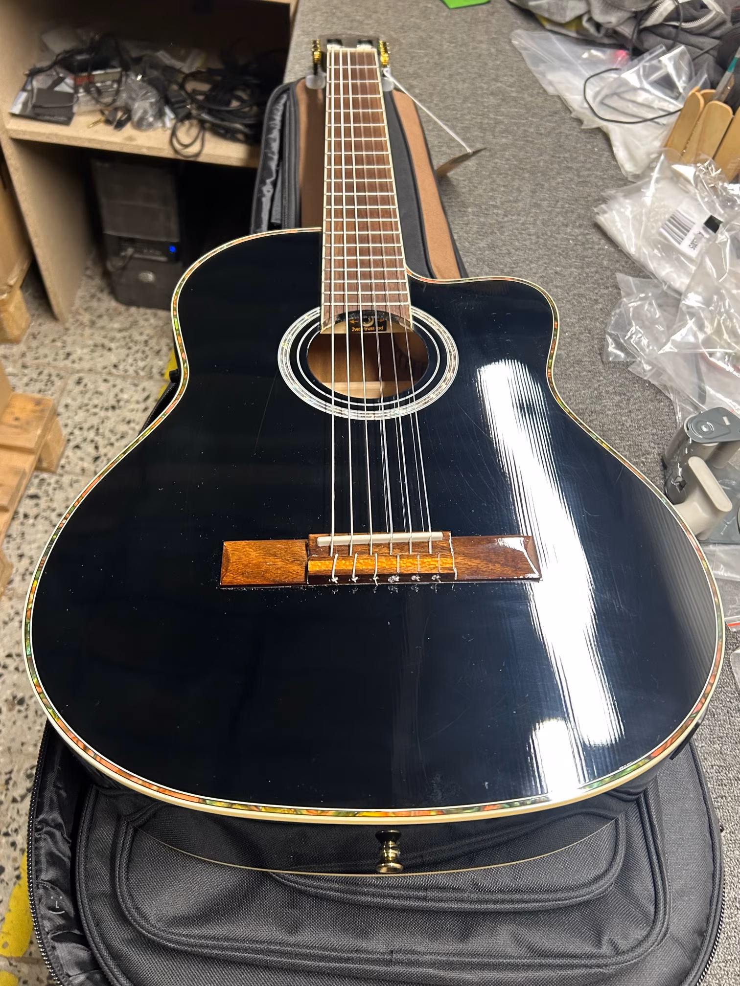 Die klassischen Gitarren der Marke Ortega aus der Serie Family Pro sind die ideale Wahl für Spieler aller Leistungsstufen, die ein hochwertiges Instrument zu einem erschwinglichen Preis suchen. Kommen Sie vorbei und probieren Sie sie aus. Es handelt sich um Gitarren mit einem halbmassiven Korpus aus einer Decke aus massiver Fichte oder Zeder und Zargen und Boden aus laminiertem Mahagoni, einem massiven Mahagonihals mit zweiseitiger Verstärkung und einem Griffbrett aus Walnussholz. Die Saiten sind in klassischen offenen Mechaniken und einem Steg aus Walnussholz mit zwölf Öffnungen befestigt. Traditionelle Zierelemente sind die Einfassung, die Rosette und das Firmenlogo auf dem Kopf des Instruments. Dieses spezielle Modell ist zusätzlich mit Ortega MagusPro-NL-Elektronik mit integriertem Stimmgerät, Dreifach-Equalizer, Lautstärkeregler und Phase-Taste mit Phasenumkehrfunktion (Rauschunterdrückung) ausgestattet. Die Gitarre wird in einer Instrumententasche (Gig Bag) geliefert.