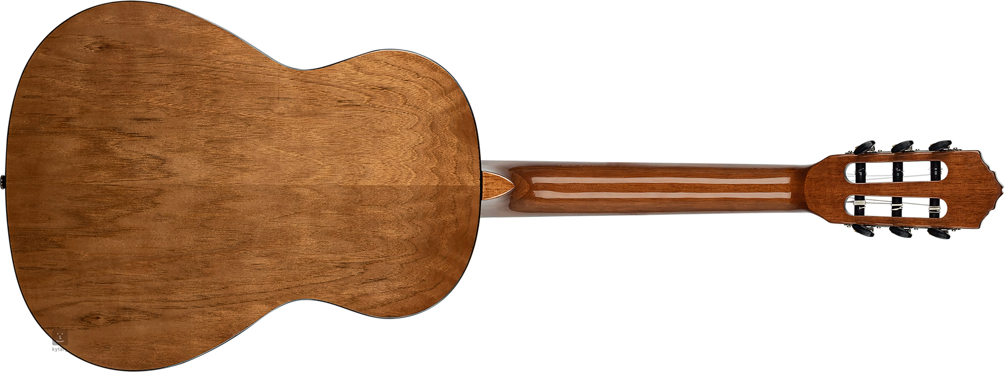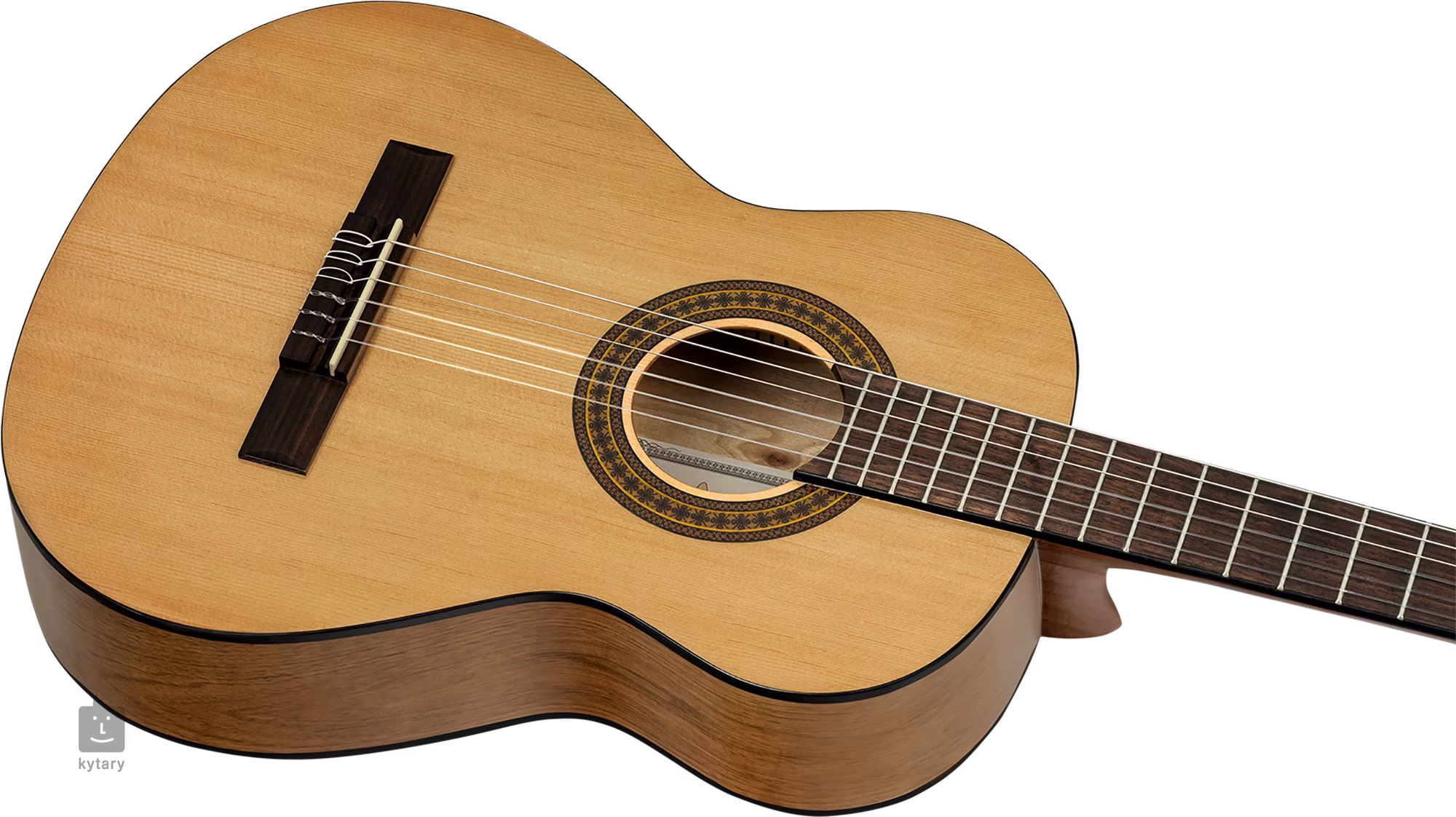 Dieses Set ist erschwinglich und eignet sich für Kinder und junge Musikstudenten, deren kleinere Finger durch den schmaleren Hals und die kürzere Mensur der Gitarre unterstützt werden. Der Korpus des Instruments besteht aus Fichten- und Katalpa-Sperrholz, das Griffbrett aus Walnussholz mit achtzehn Bünden ist auf den Mahagonihals geklebt. Das schlichte Design ist dezent mit einer Rosette, einer schwarzen Kunststoffleiste und einem Logo auf der Kopfplatte verziert.
