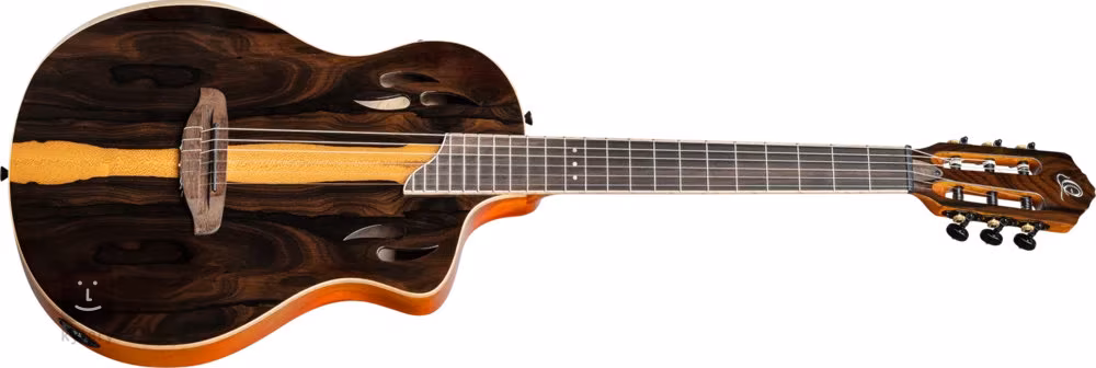 Die aktive Elektronik Ortega MagusX/G mit einem dreistufigen Equalizer und einem eingebauten Stimmgerät bietet die Möglichkeit der Verstärkung. Die Saiten werden über den ABS-Sattel in klassischen Stimmmechaniken in schwarzer Ausführung und einem Steg aus Feigenholz befestigt. Die schöne Verarbeitung wird durch die Armauflage und die Einfassung aus geflammtem Ahorn unterstrichen.