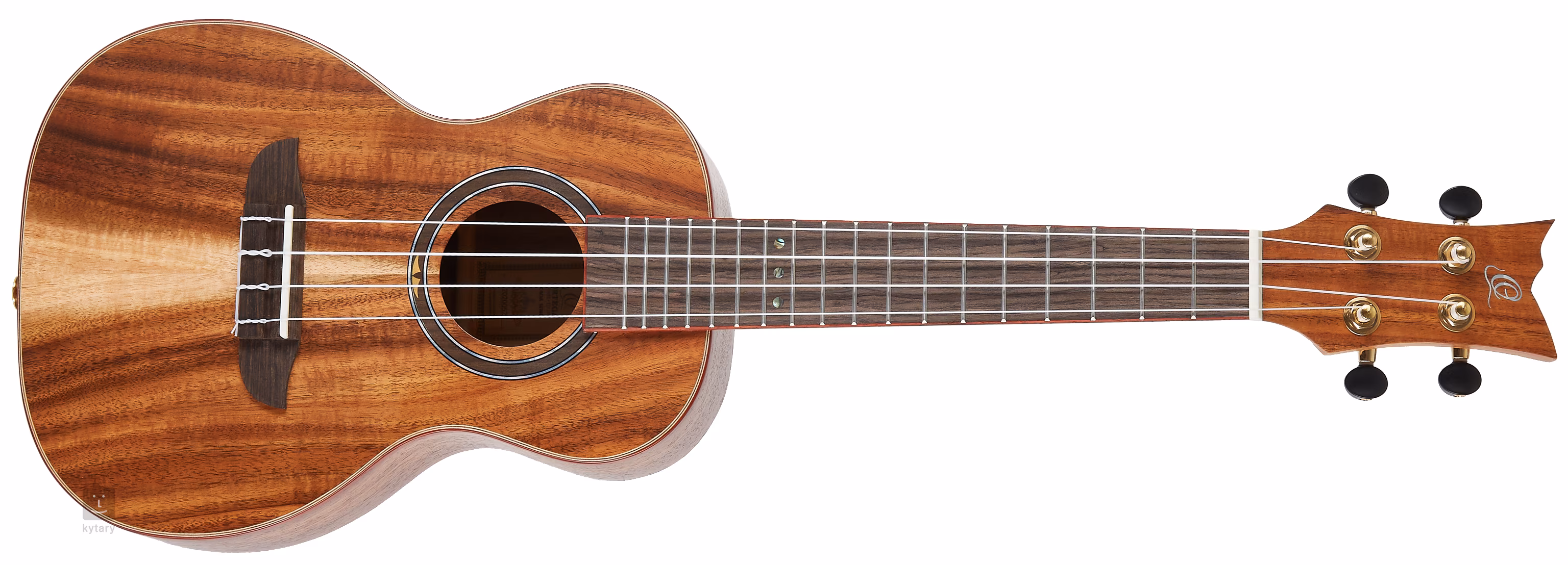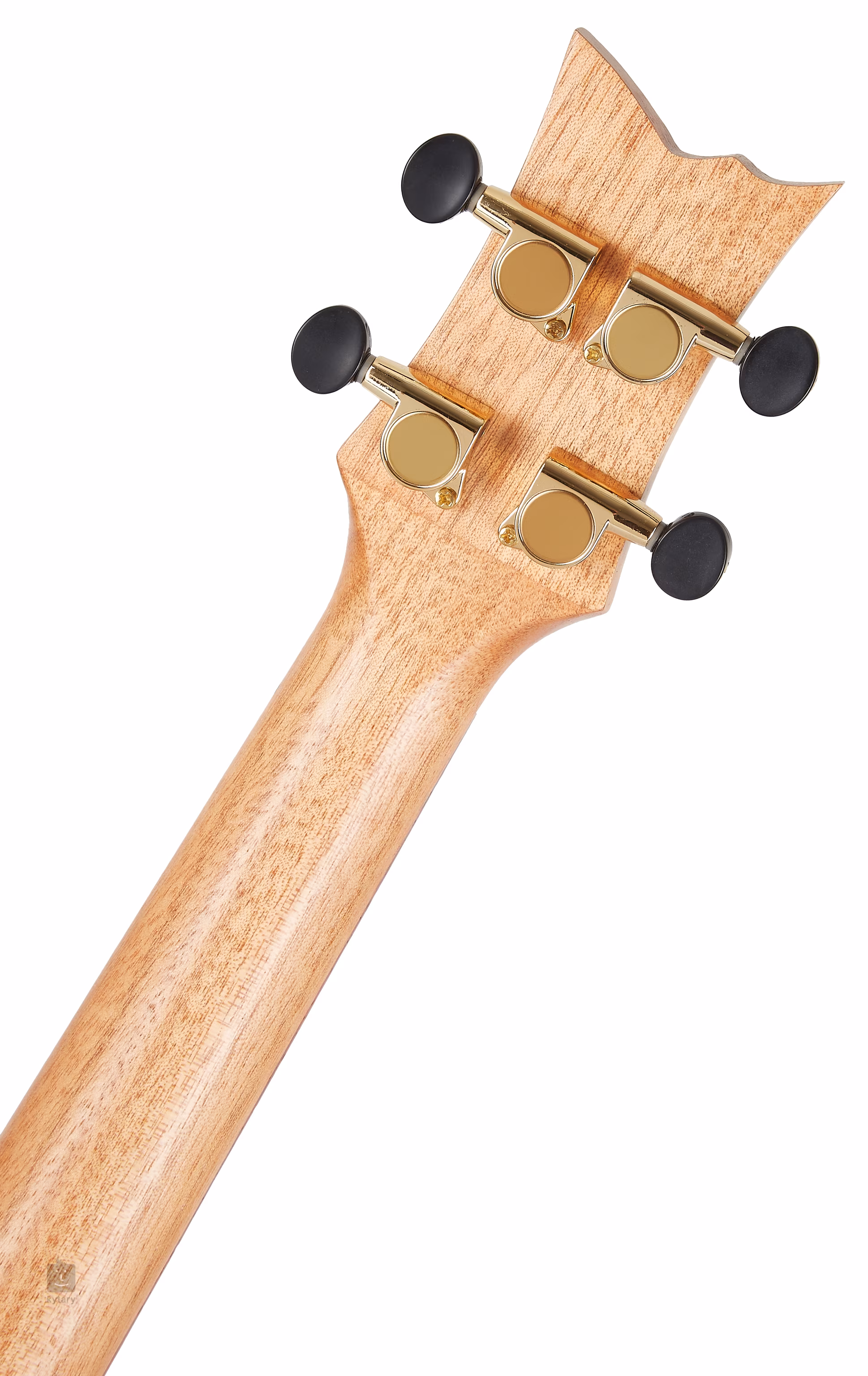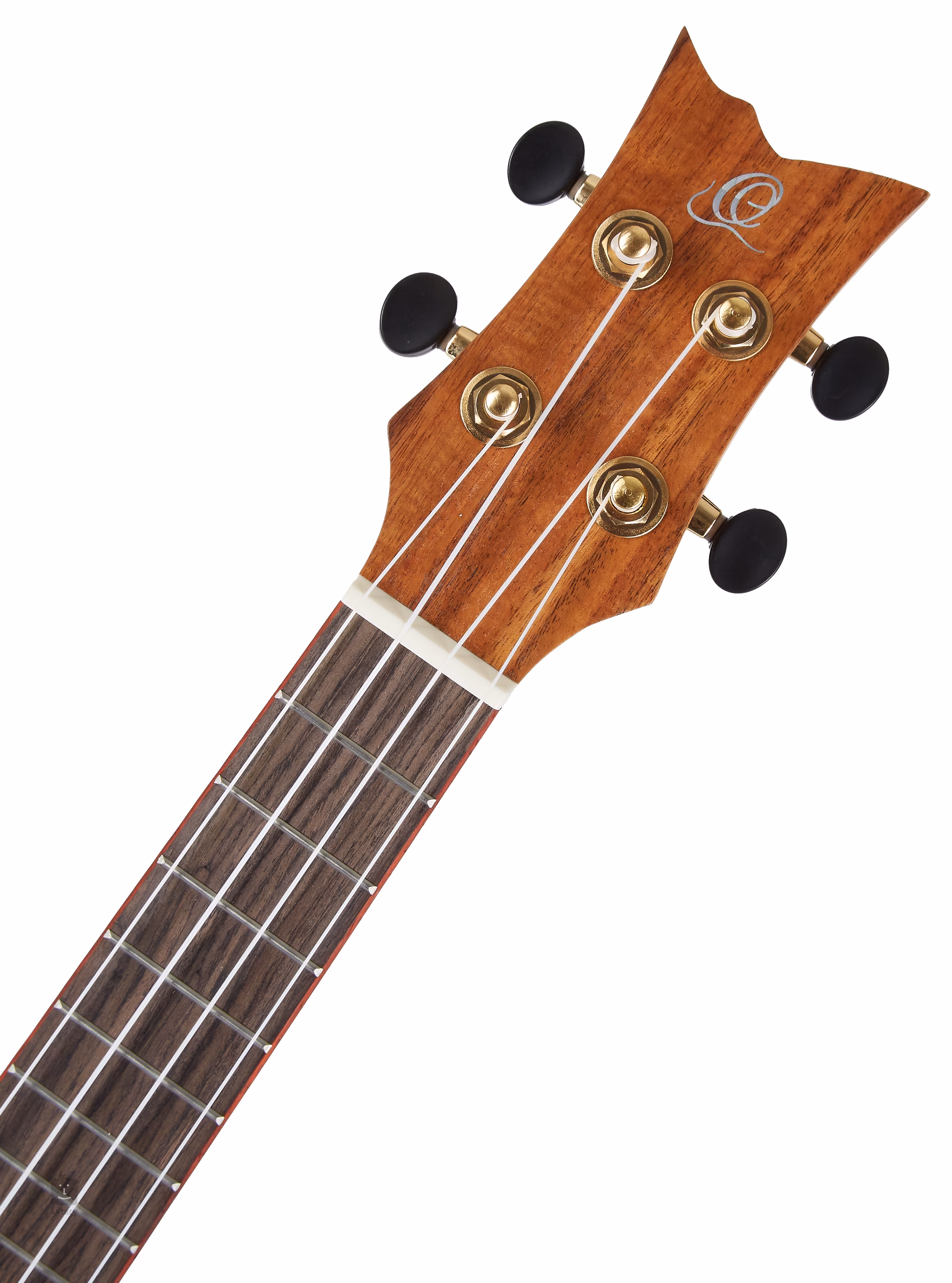 Der Korpus dieser Konzert-Ukulele ist aus massivem Akazienholz mit einer matten, offenporigen Lackierung gefertigt. Der Okoumé-Hals ist mit einem Griffbrett aus Teakholz mit achtzehn Bünden versehen. Die Saiten sind in einer Komposit-Kopfplatte und geschlossenen goldenen Stimmmechaniken (Die-Cast) mit schwarzen Wirbeln gelagert. Der edle Look wird durch die Einfassung von Korpus und Griffbrett aus Padouk und die dekorative Rosette noch unterstrichen.