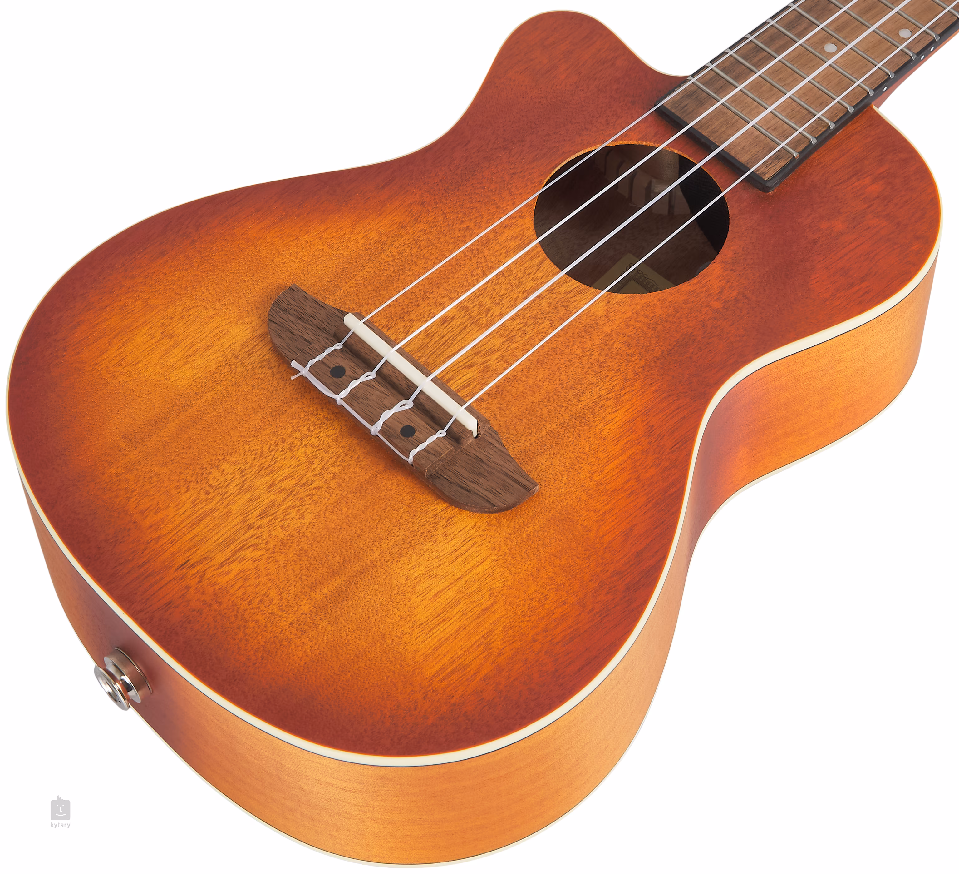 Der Resonanzboden dieser Ukulele besteht aus Okoumé-Sperrholz, während Boden und Zargen aus Sapele gefertigt sind. Die Decke ist mit einer Dawn-Sunburst-Lackierung und weißem ABS-Randeinband versehen. Auf den Mahagoni-Hals ist ein Griffbrett aus Walnussholz geklebt, das mit achtzehn Bünden und weißen Positionspunkten versehen ist. Die Saiten werden in einem Walnuss-Griffbrett und geschlossenen Stimmmechaniken des Gitarrentyps (Die-Cast) gehalten.