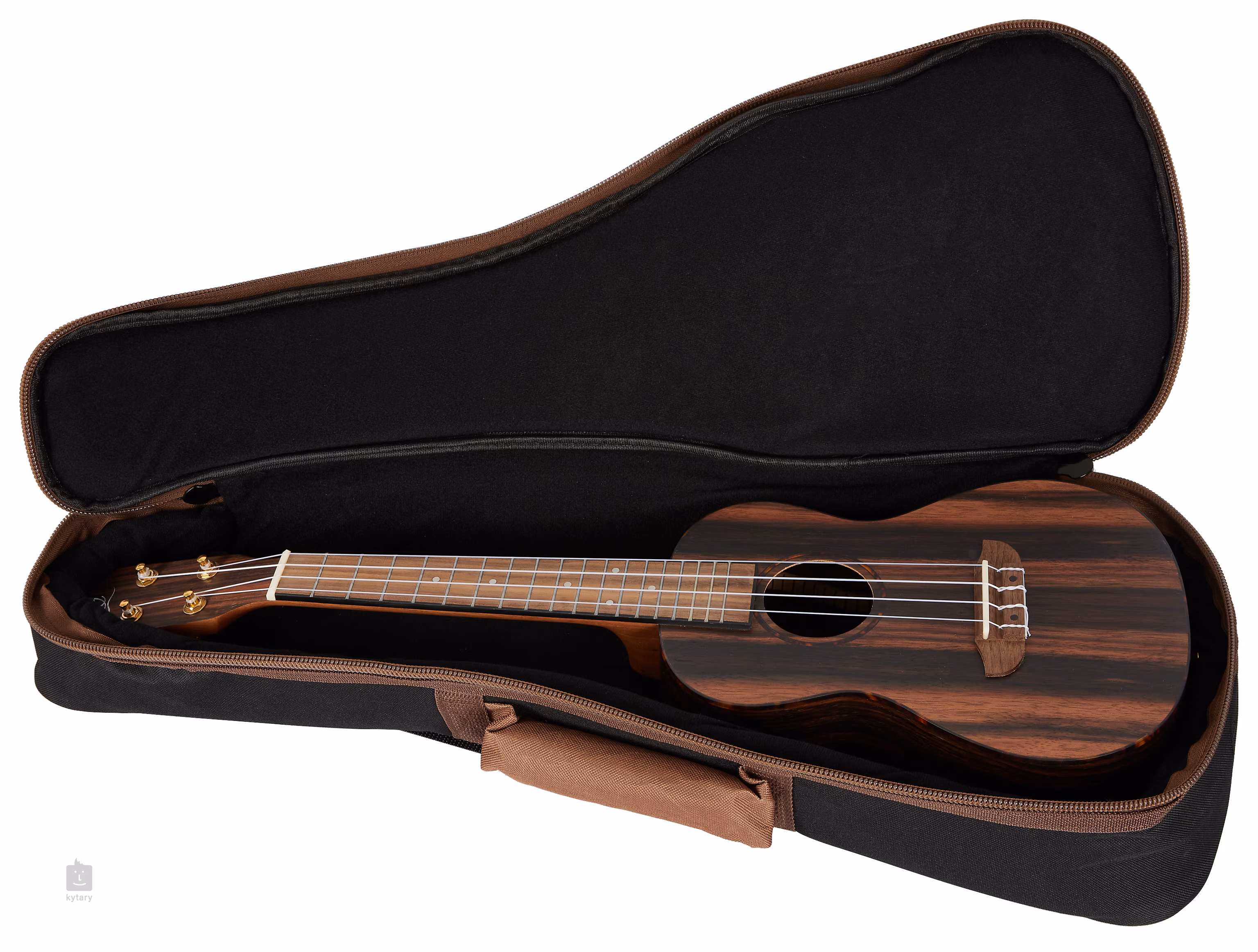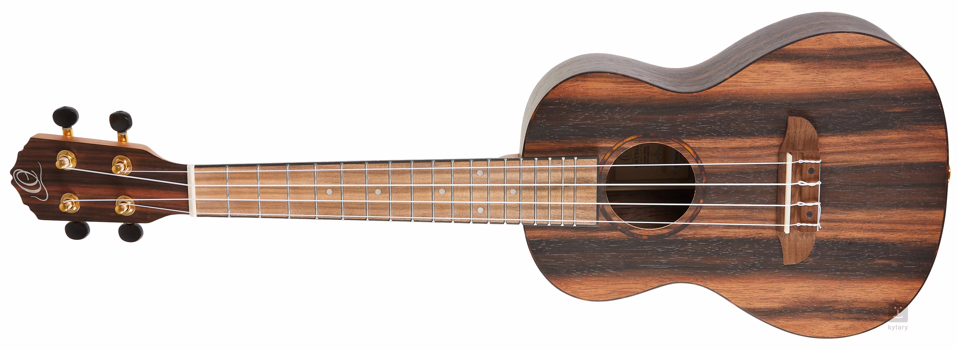 Der Korpus dieser Konzert-Ukulele ist aus umspritztem Ebenholz gefertigt. Ein Griffbrett aus Walnussholz mit achtzehn Bünden und weißen Positionspunkten ist auf den Mahagonihals geklebt. Die Saiten sind in einem Nussbaum-Griffbrett und geschlossenen Stimmmechaniken vom Typ Gitarre (Die-Cast) gelagert. Die schöne Verarbeitung wird durch das Binding und die Rosette aus Schildpatt-Imitat noch unterstrichen.