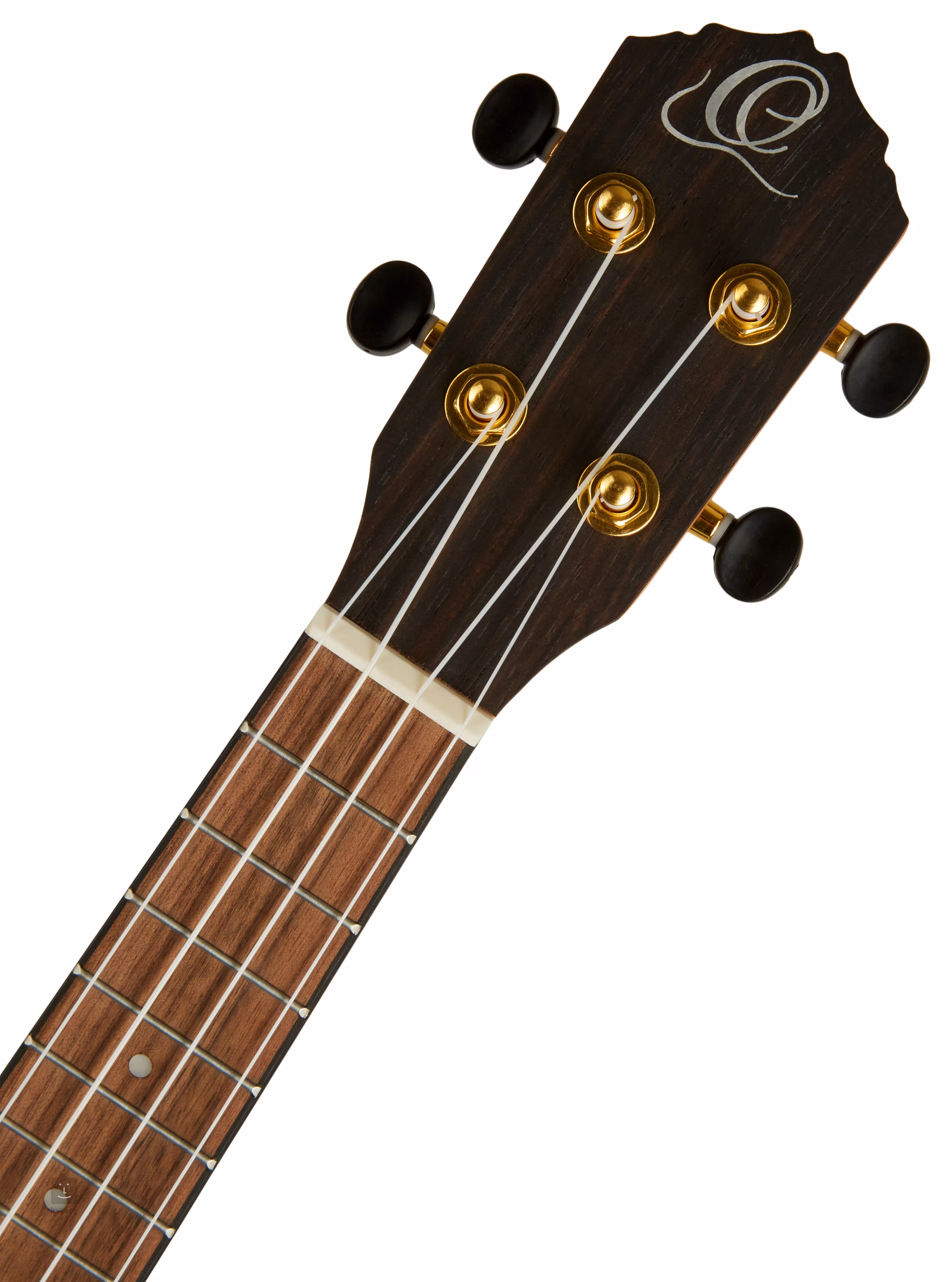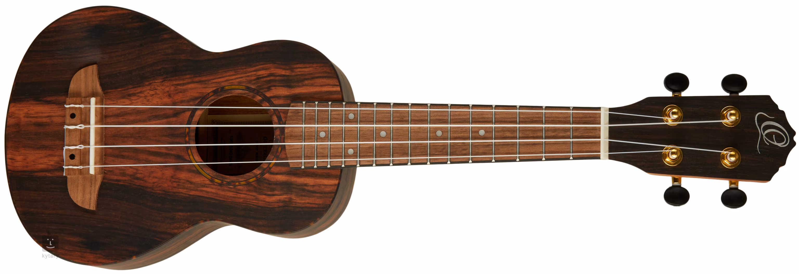 Der Korpus dieser Sopran-Ukulele ist aus umspritztem Ebenholz gefertigt. Der Mahagonihals ist mit einem Walnuss-Griffbrett mit fünfzehn Bünden und weißen Positionspunkten ausgestattet. Die Saiten sind in ein Griffbrett aus Walnussholz und geschlossene gitarrenähnliche Stimmmechaniken (Die-Cast) in Gold eingefasst. Das edle Aussehen wird durch die Schildpatt-Zierleiste und die Rosette unterstrichen.