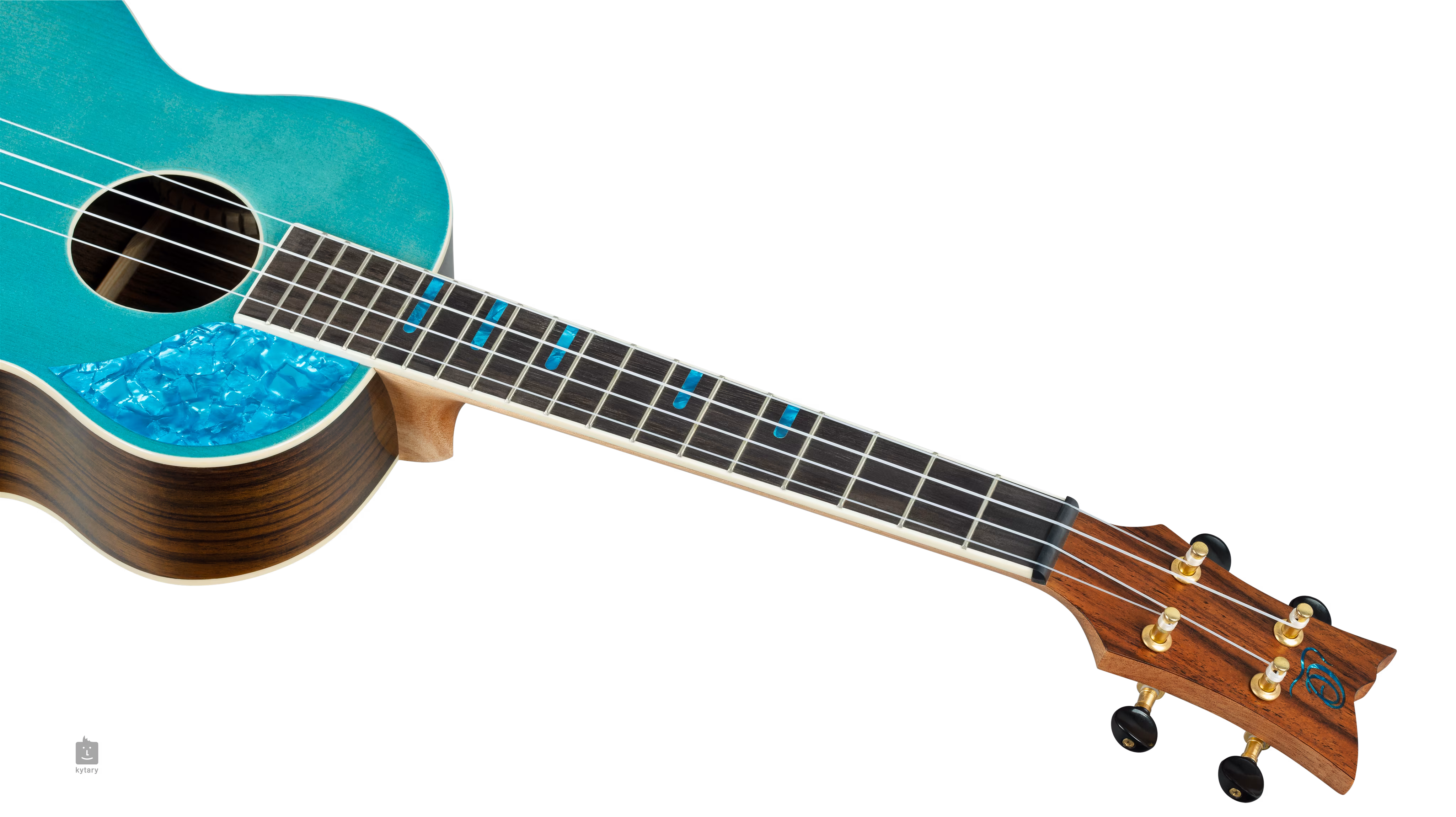 Ein Palisander-Griffbrett mit achtzehn Bünden ist auf den Mahagoni-Hals geleimt. Positionsmarkierungen im "blue pearl"-Design machen das Griffbrett leicht navigierbar. Die Saiten sind in einem Palisander-Griffbrett und offenen Stimmmechaniken in Gold-Finish mit schwarzen Wirbeln montiert. Die schöne Verarbeitung wird durch das Palisanderfurnier an der Kopfplatte und das weiße Kunststoffbinding unterstrichen.