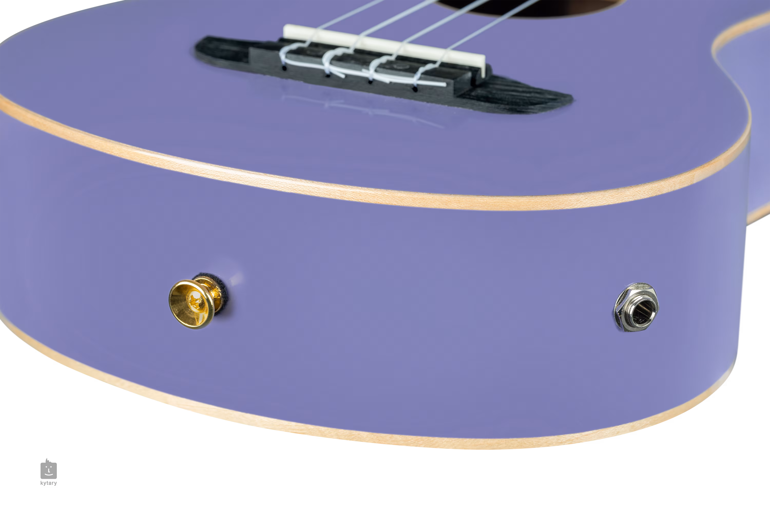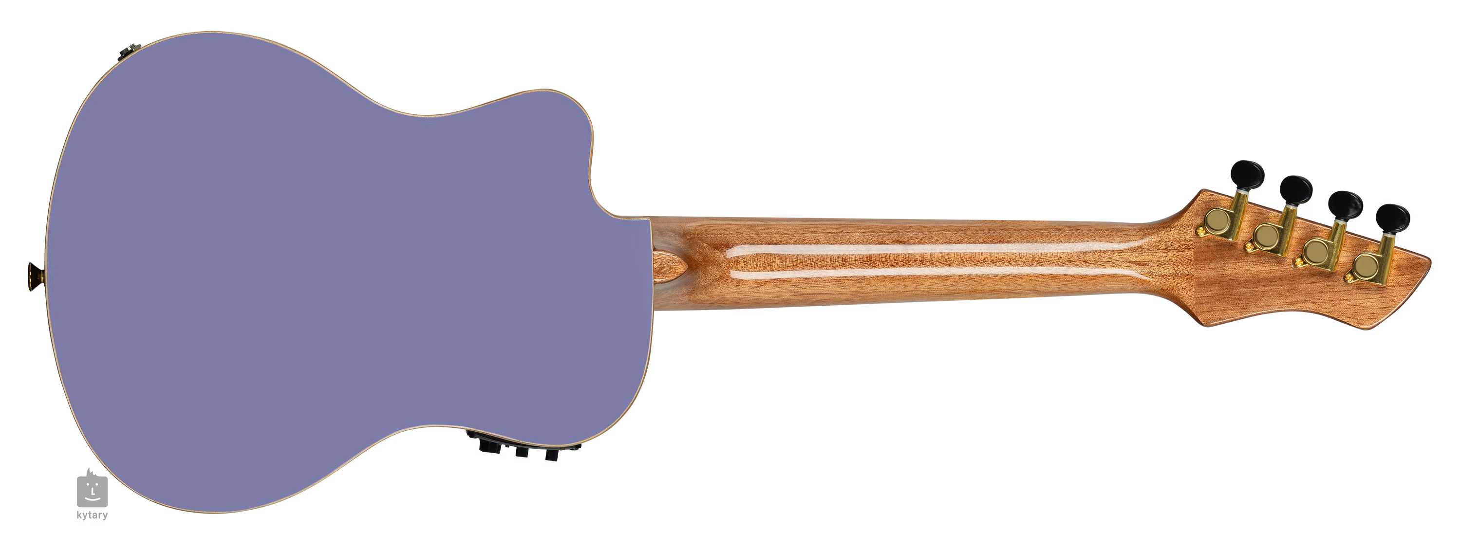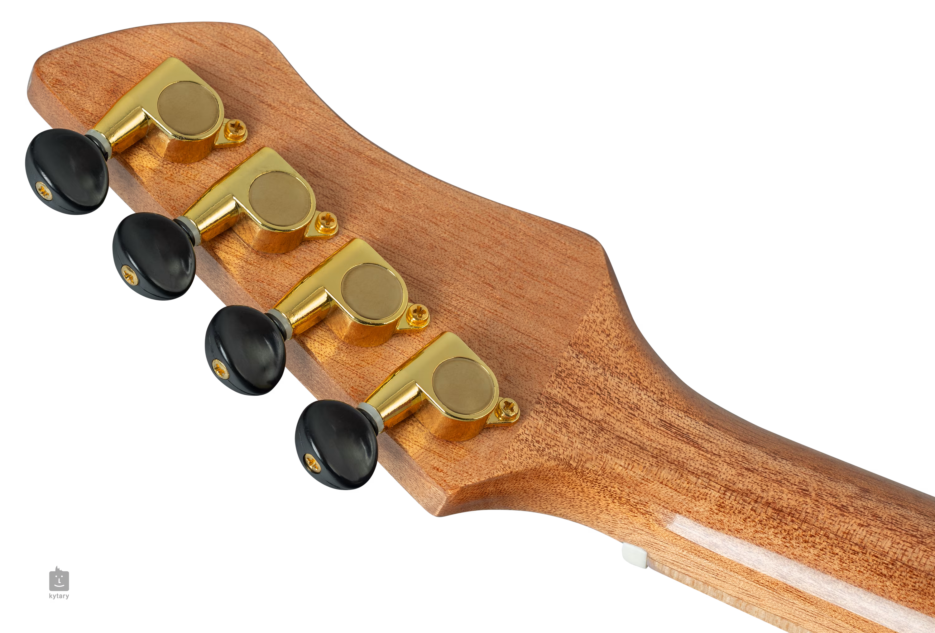 Die Saiten sind in einer Komposit-Kopfplatte und Stimmmechaniken in Goldoptik mit schwarzen Wirbeln montiert. Die schöne Verarbeitung wird durch das Okoumé-Furnier auf der Kopfplatte und die weiße Kunststoffzierleiste unterstrichen.