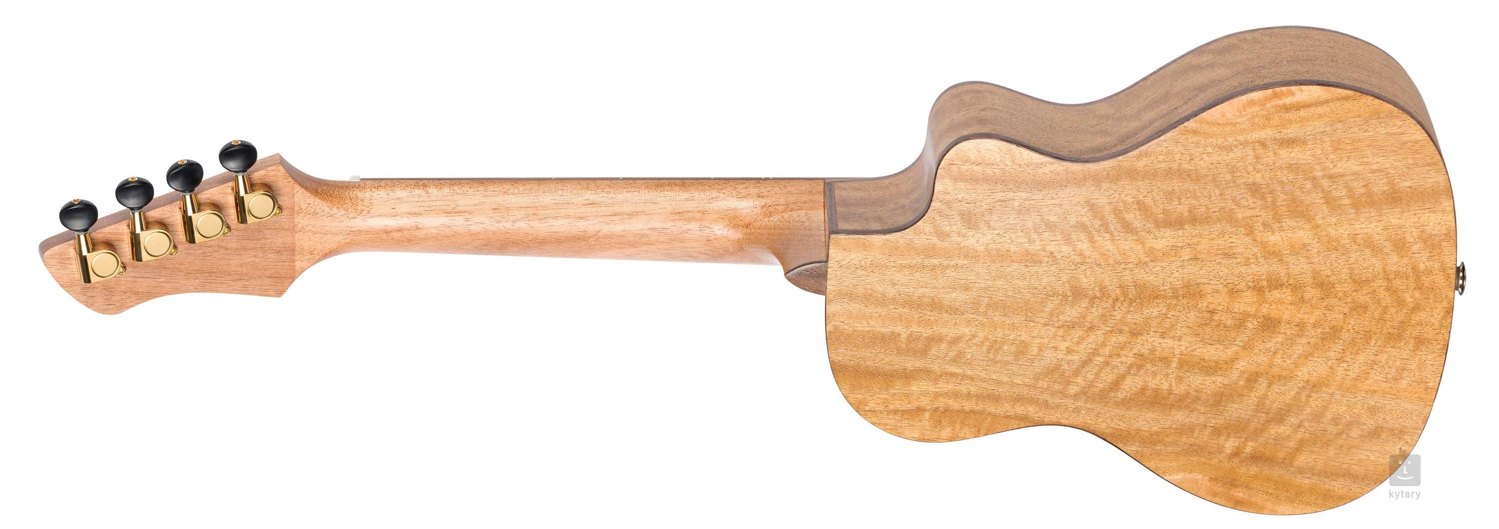 Der Korpus dieser Ukulele ist aus umspritztem Mangoholz gefertigt. Auf den Okoumé-Hals ist ein Griffbrett aus Tecwood-Verbundmaterial mit achtzehn Bünden geklebt. Die Saiten sind in einem Komposit-Kolben und geschlossenen schwarzen Stimmmechaniken (Die-Cast - 4 in Linie) mit schwarzen Wirbeln montiert. Das edle Aussehen wird durch das Walnuss-Binding des Korpus und des Griffbretts unterstrichen.