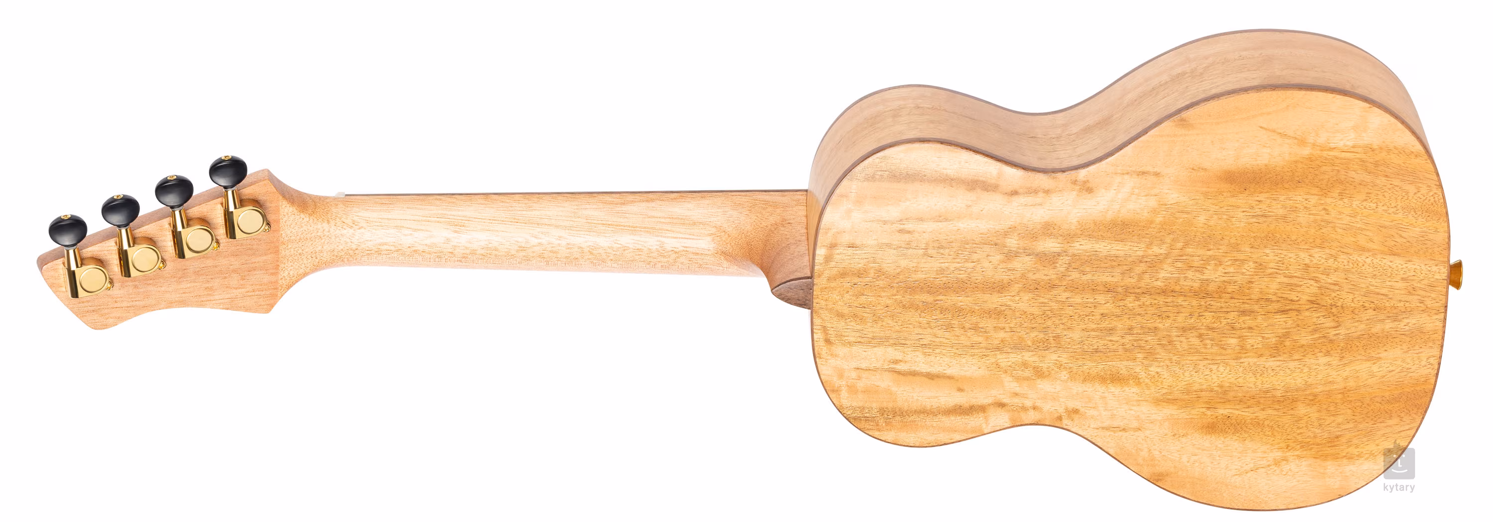 Der Korpus dieser Ukulele ist aus umspritztem Mangoholz gefertigt. Auf den Okoumé-Hals ist ein Griffbrett aus Tecwood-Verbundmaterial mit achtzehn Bünden geklebt. Die Saiten sind in einem Komposit-Kolben und geschlossenen schwarzen Stimmmechaniken (Die-Cast - 4 in Linie) mit schwarzen Wirbeln montiert. Der edle Look wird durch das Walnuss-Binding von Korpus und Griffbrett unterstrichen.