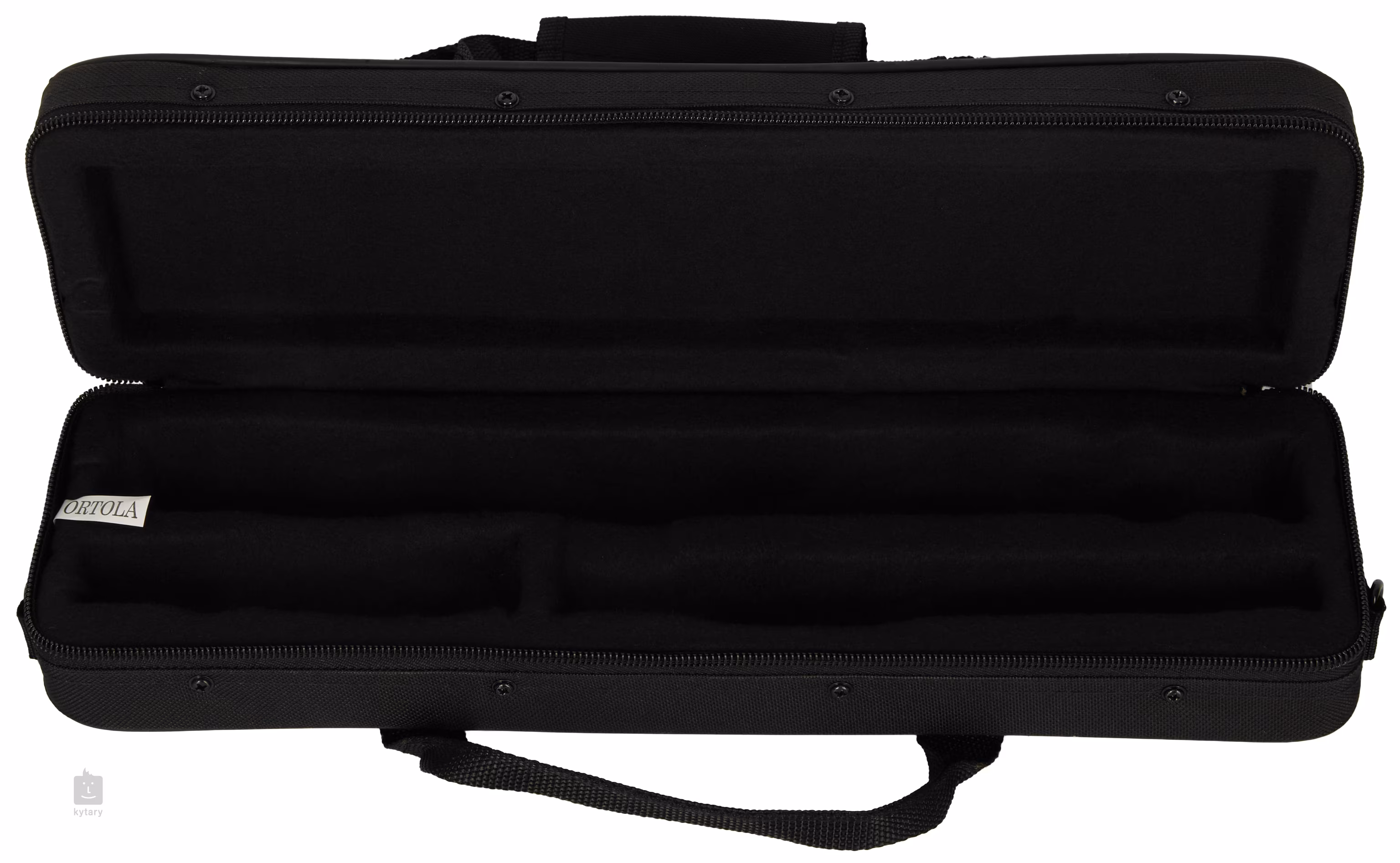 Querflötenetui aus plastifiziertem Polyester. Mit einer Außentasche für kleine Accessoires, einem geformten Innenraum (Polystyrol) mit Veloursfutter, einem Tragegriff, einem Schulterriemen und einem Reißverschluss.