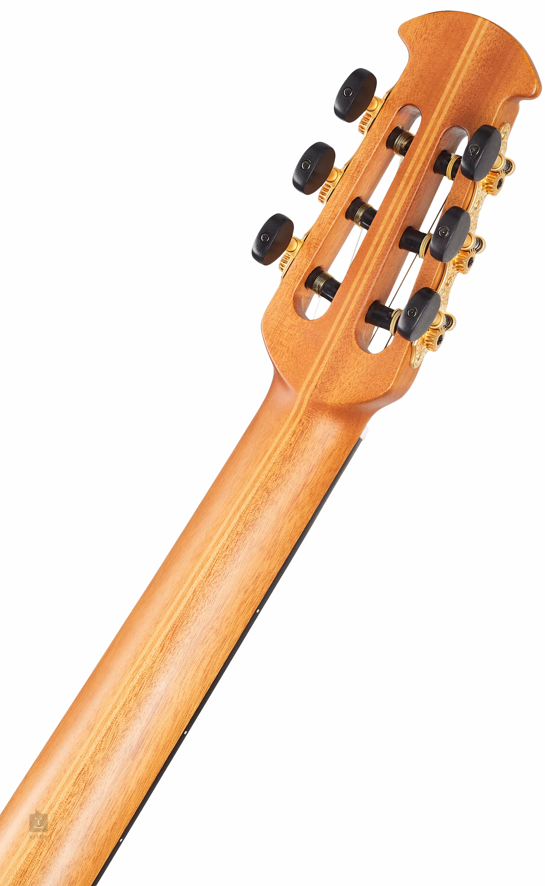 Ein fünfteiliger Hals aus Mahagoni und Ahorn ist auf ein Ebenholzgriffbrett mit neunzehn Bünden geklebt. Der niedrigere Korpus-Cutaway und der schmalere Hals werden nicht nur von Musikern geschätzt, die an E-Gitarrenprofile gewöhnt sind, sondern auch von Spielern des Flamenco, der lateinamerikanischen Musik, des Jazz und anderer Genres. Die Saiten werden von einem Griffbrett aus Pau-Ferro-Holz und klassischen offenen Stimmmechaniken in Goldoptik mit schwarzen Wirbeln gehalten. Das stilvolle Design des Instruments wird durch eine dekorative Rosette und eine weiße Randeinfassung akzentuiert.