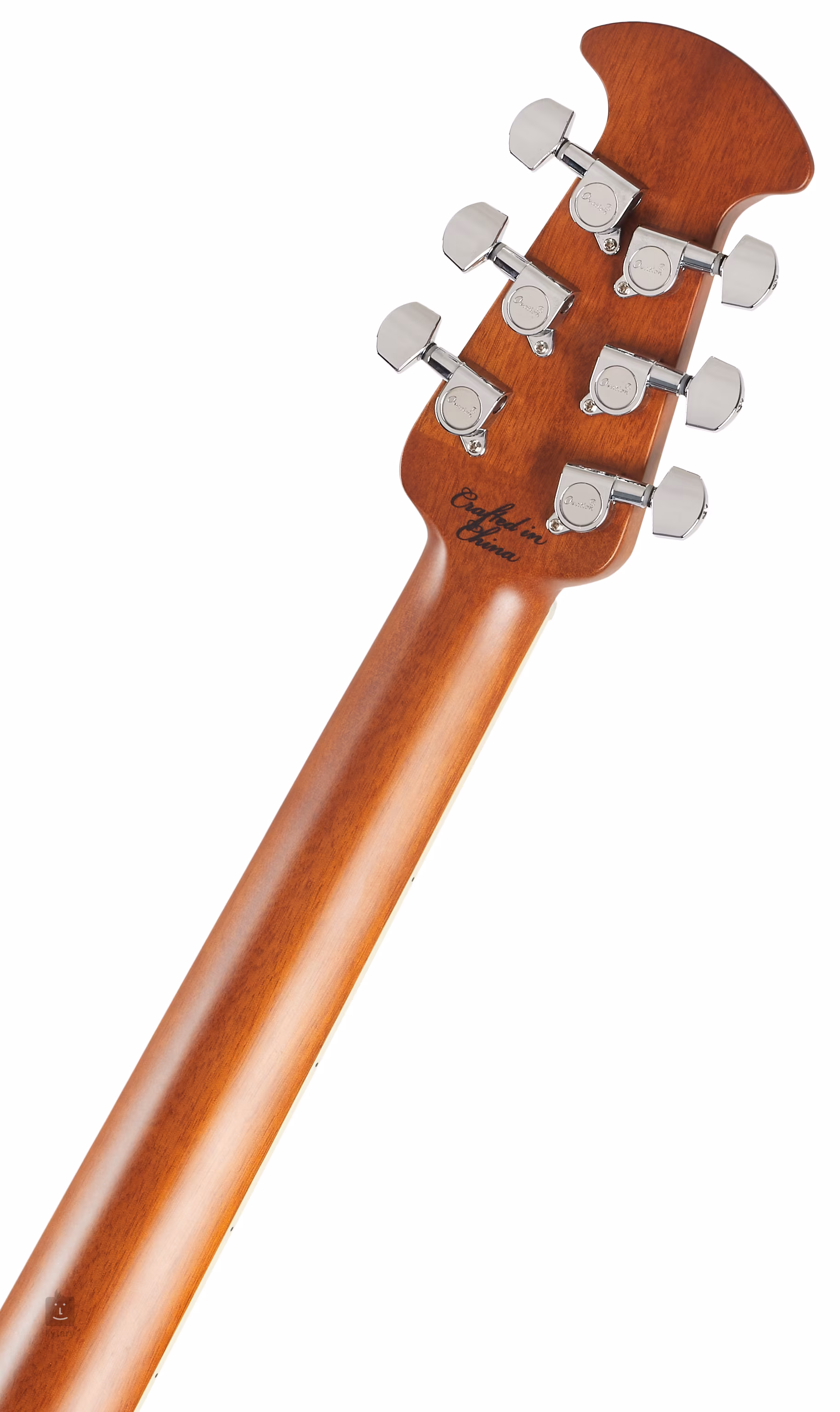 Ein weiteres interessantes Merkmal ist das abgeschrägte Griffbrett, das auf der dicksten Basssaite siebzehn Bünde bietet, während auf der dünnsten Saite sechs weitere Bünde zur Verfügung stehen. Die Saiten selbst sind in einem Ovangkol-Griffbrett gelagert und von einer Druckgussmechanik umgeben. Das stilvolle Design des Instruments wird durch die dekorativen Schalllochzungen auf dem Resonanzboden, die Sunburst-Lackierung der Decke und die schwarze Korpusumrandung unterstrichen.