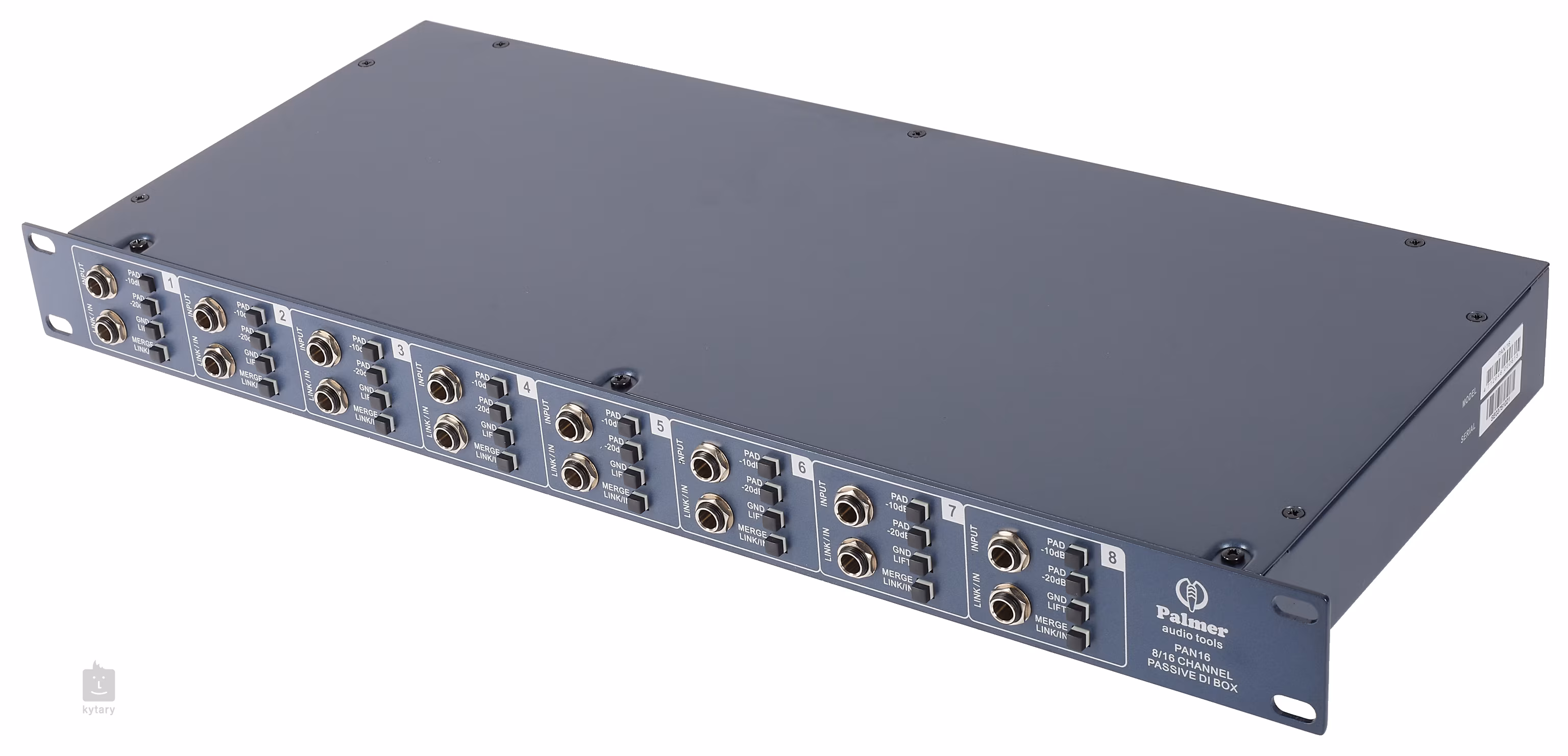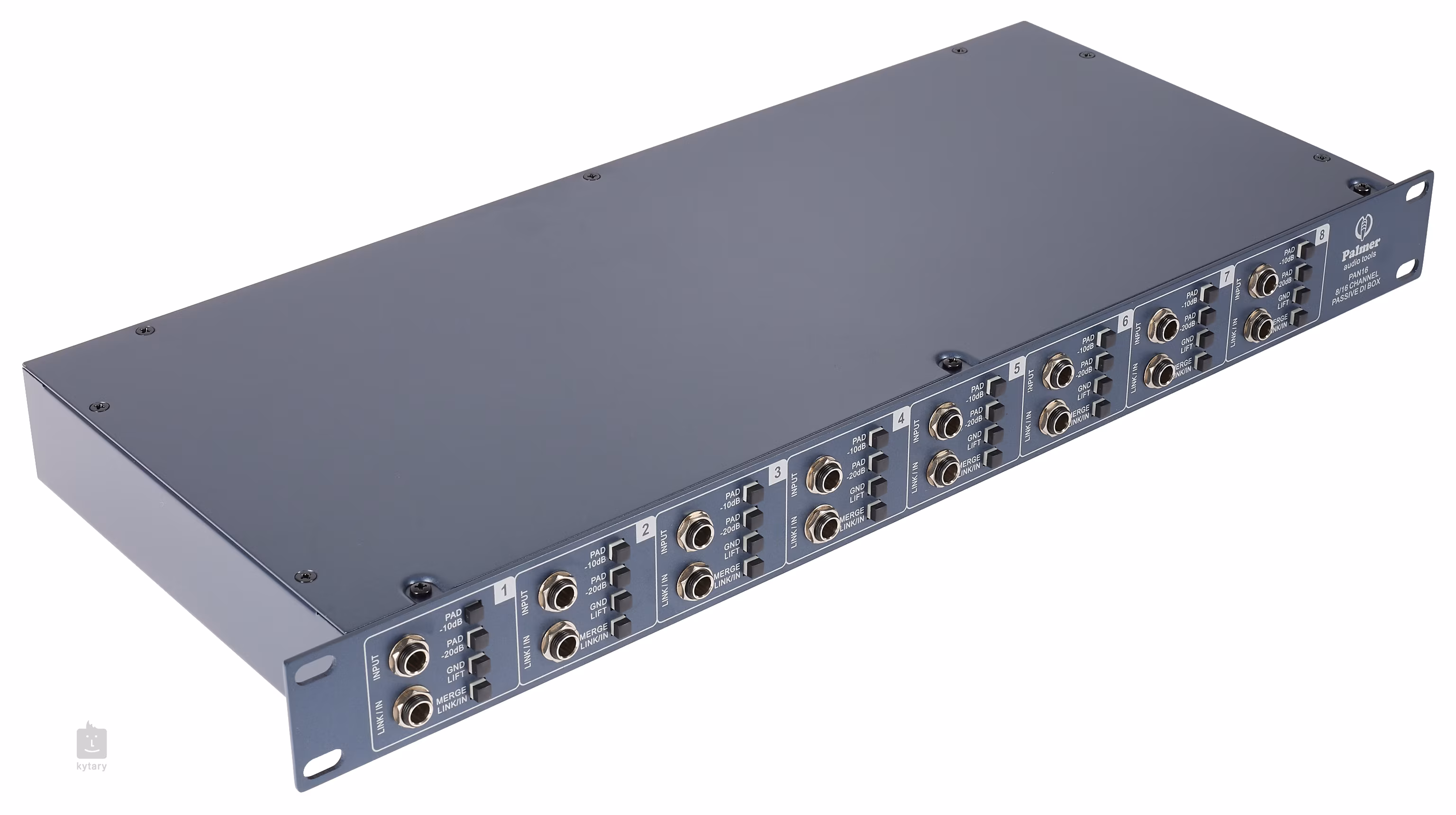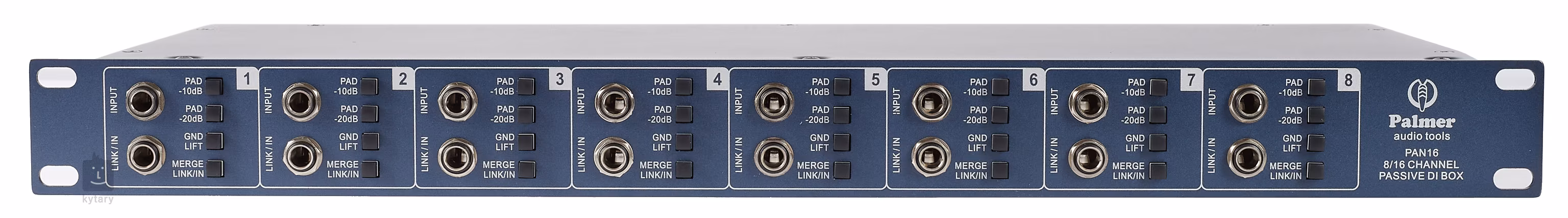Palmer PAN16 ist eine passive DI-Box mit acht Kanälen. Jeder Kanal verfügt über Tasten für die Dämpfung (-10, -20 dB), die Erdung und eine Merge Link/In-Funktion, die die Ausgangsleitung an der Frontplatte auf den Eingang schaltet. Es stehen also maximal 16 Eingänge zur Verfügung. Separate Ausgänge für jeden Kanal im XLR- und 6.3-Klinkenformat befinden sich auf der Rückseite. Das Gerät bietet einen Frequenzbereich von 10 Hz - 40 kHz, ist in einem Metallgehäuse untergebracht und für den Einbau in ein 19"/1 HE-Rack vorbereitet.