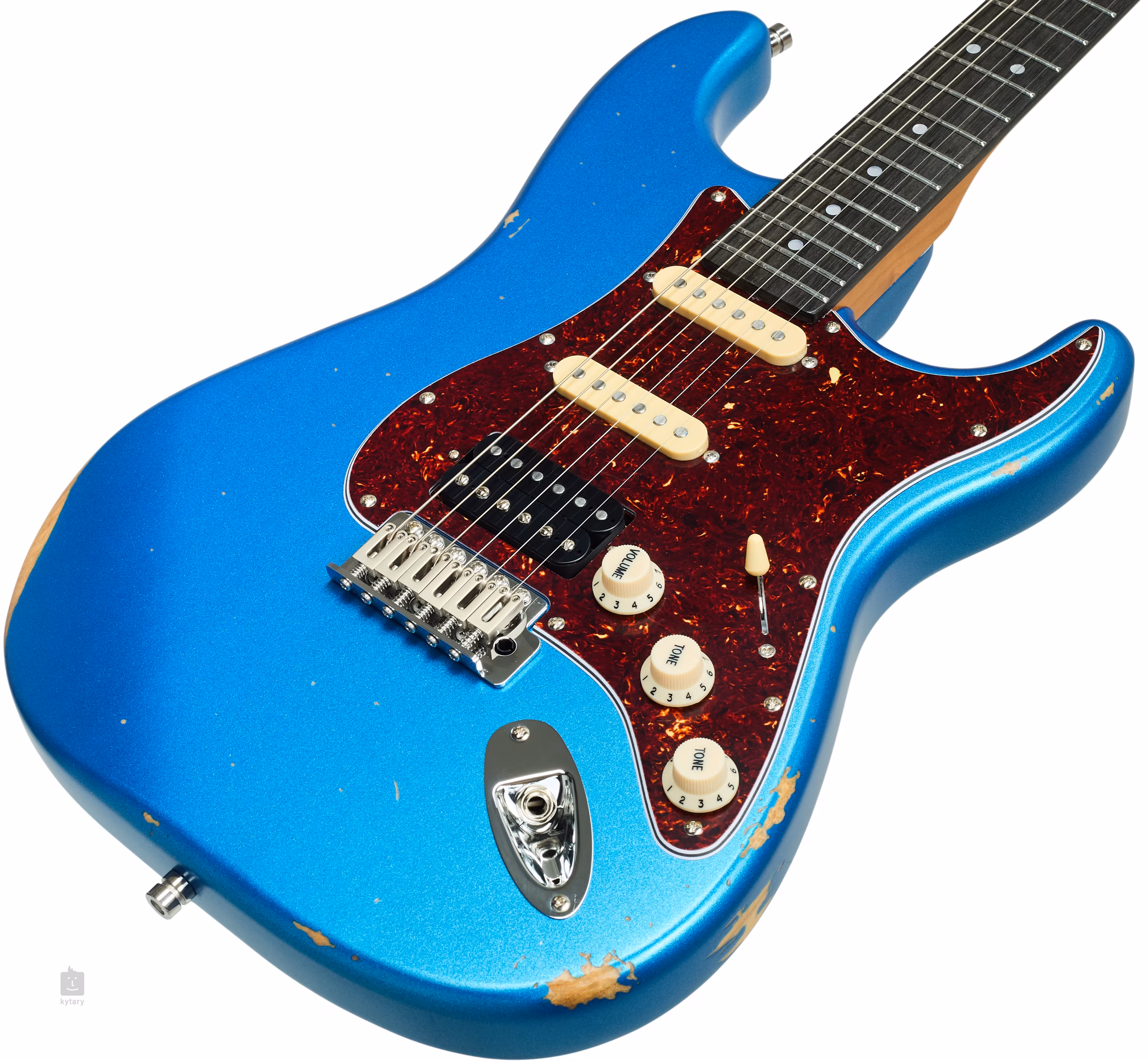 Die HSS-Konfiguration der handgewickelten Tonabnehmer mit Alnico V-Magneten verleiht der Gitarre sowohl die klassischen klaren Töne der ST-Single-Coils als auch den kraftvollen Klang des Steg-Humbuckers. Die Klangkonturen können mit den Standardreglern eingestellt werden. Die Saiten werden über den Nullsattel aus Knochen in den verschließbaren Stimmmechaniken mit einer Übersetzung von 1:19 und dem Tremolo befestigt. Die stilvolle Verarbeitung wird durch ein Pickguard aus Imitations-Schildpatt unterstrichen.
