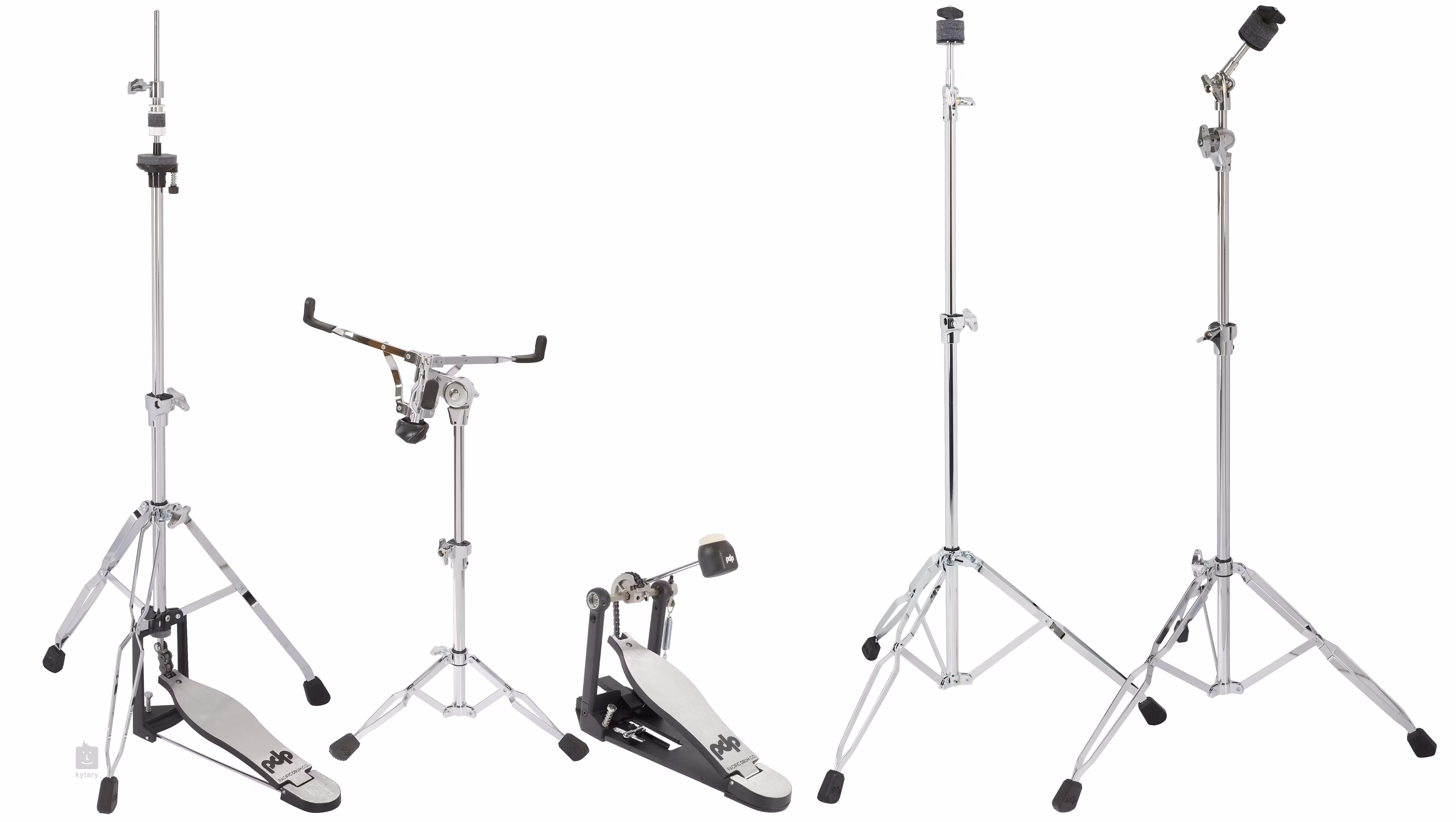 Das PDHW715 PDP 700 Series Hardware Pack enthält fünf leichtgewichtige und einfach zu transportierende Teile der 700er Serie, nämlich einen geraden Beckenständer, einen Beckenständer-Whipper, einen Hi-Hat-Ständer, einen Snare-Drum-Ständer und ein PDSP710 Bassdrum-Pedal mit verkettetem Einzelkettengetriebe. Die Ständer verfügen über ein Glide-Tilter-Gelenk zur einfachen Einstellung des Armwinkels, doppelte Beine für bessere Stabilität und gummierte Füße, um ein Verrutschen des Ständers zu verhindern.