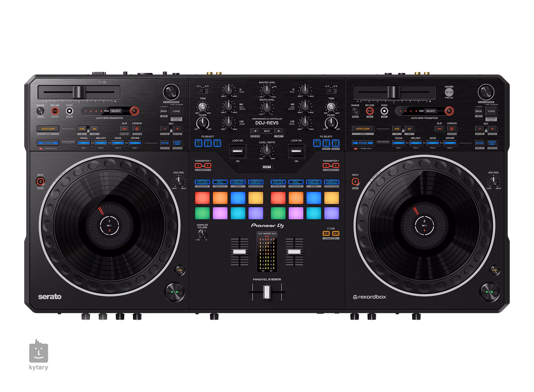 Der Pioneer DJ DDJ-REV5 verfügt über große Jogwheels, die reaktionsschnell und einfach zu bedienen sind und ein ähnliches Design wie klassische CDJ-Geräte aufweisen. Jedes dieser Räder verfügt über ein eigenes Display, das die Position des Abspielkopfes anzeigt. Das Gerät verfügt über einen MAGVEL FADER für präzises Scratchen und hat ein vom Scratching inspiriertes Design mit Performance Pads und Lever FX für dynamisches Spielen.