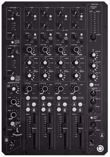 SEND & RETURN Zwei AUX-Treiber leiten das Kanalsignal an den Aux-Ausgang (Klinke 6,3 mm TRS) zur Verwendung mit externen Effektprozessoren weiter oder können in einigen Anwendungen zum Anschluss von Abhörmonitoren verwendet werden, für die sonst der BOOTH-Ausgang reserviert ist. AUX 1 bietet PRE oder POST FADE, während AUX 2 intern auf Post Fader eingestellt ist. Die beiden Stereo-Basiskanäle (Klinke 6,3 mm TRS) können als Return-Eingänge von externen Effektgeräten oder anderen Quellen verwendet werden. Jeder RETURN verfügt über eine TRIM-Funktion zur Einstellung des Return-Signals, eine DRIVE-Eingangsschaltung und CUE-Routing zu Cue A und Cue B. Jeder RETURN verfügt außerdem über eine Metering-Funktion für die visuelle Rückmeldung des Signalpegels, ein LEVEL-Drehpotentiometer zur Einstellung des Mischanteils und kombinierte Return 1-2 Low Cut EQ- und Master-Filter-Routings.