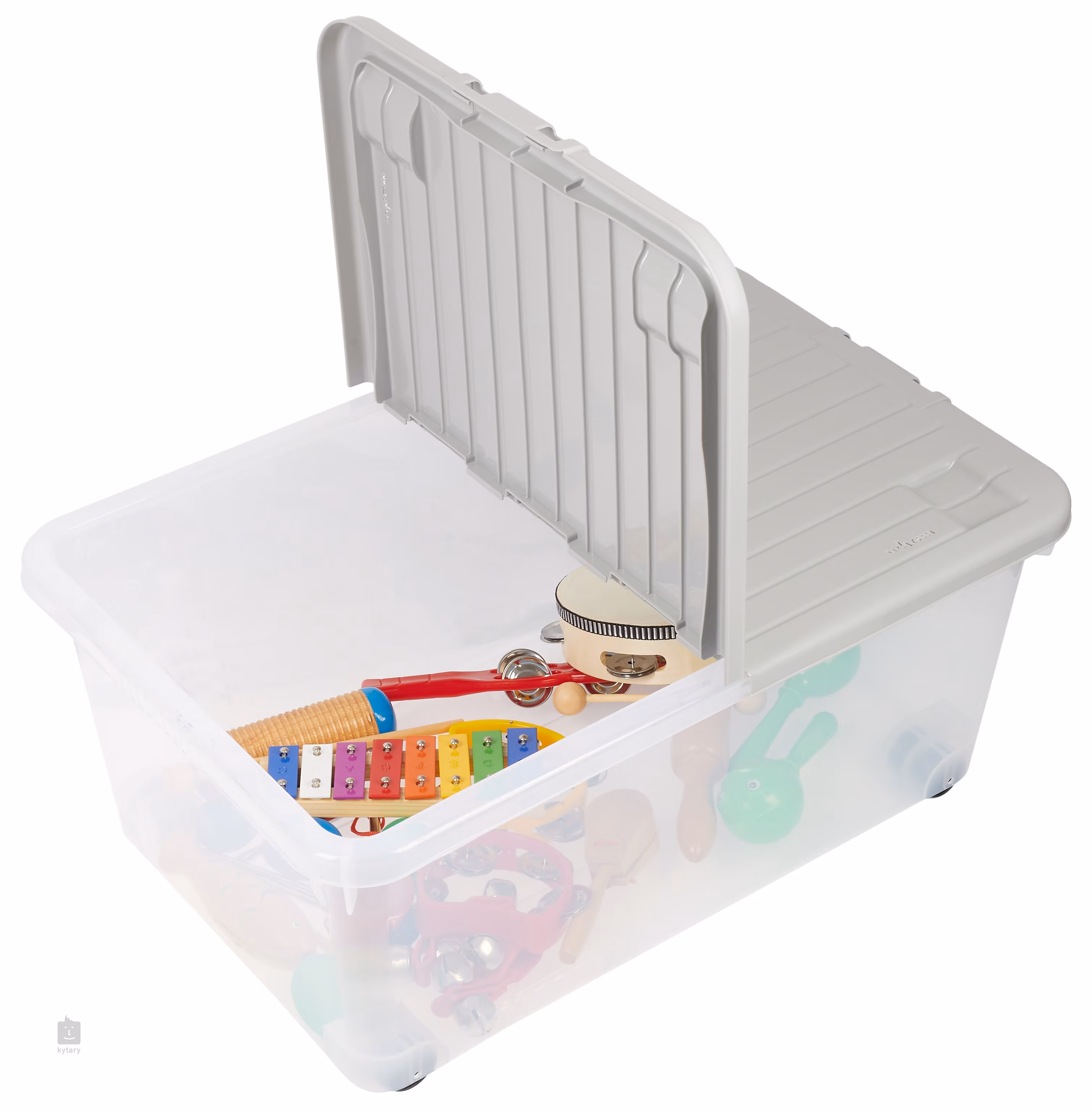 1x Flapper 1x Guiro/Shaker 1x Paar Kastagnetten mit Griff 4x Schüttler in Eiform 1x Paar Maracas in Froschform 2x Handglocke 1x Tamburin 1x Glockenspiel 1x Holzfisch 2x kleine Tamburine 1x Dreieck mit Schlägel 1x Rute mit Glocken 1x Paar Fingerkastagnetten 1x Kunststoff-Transportkiste
