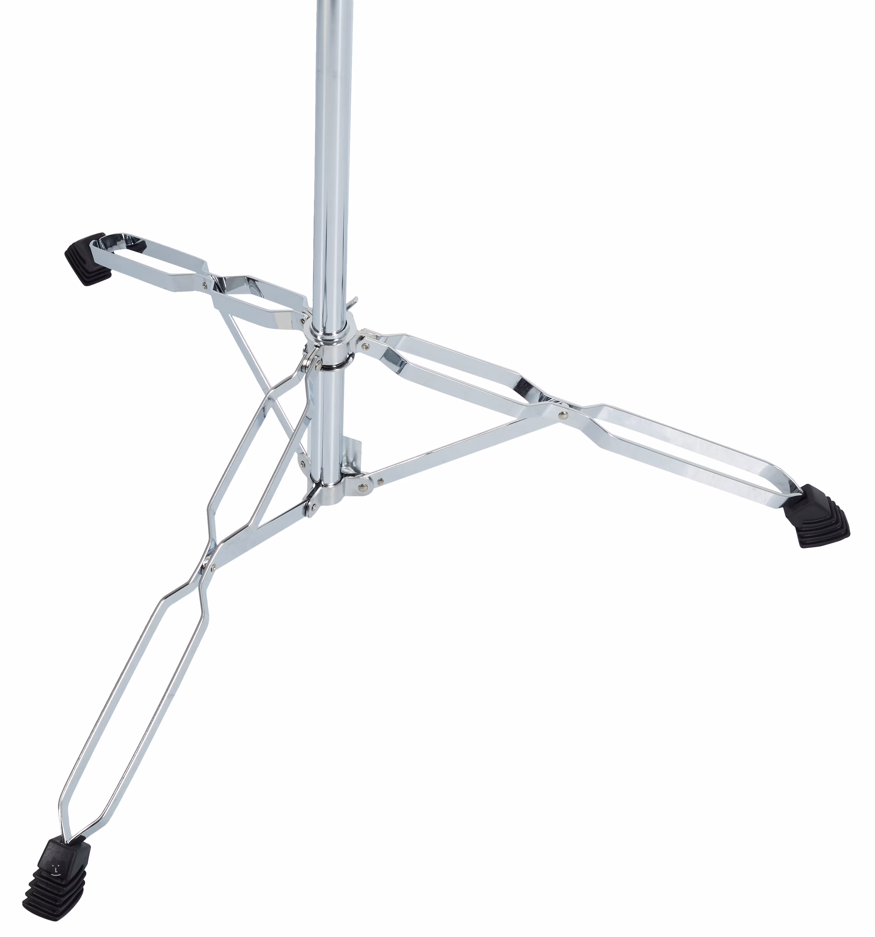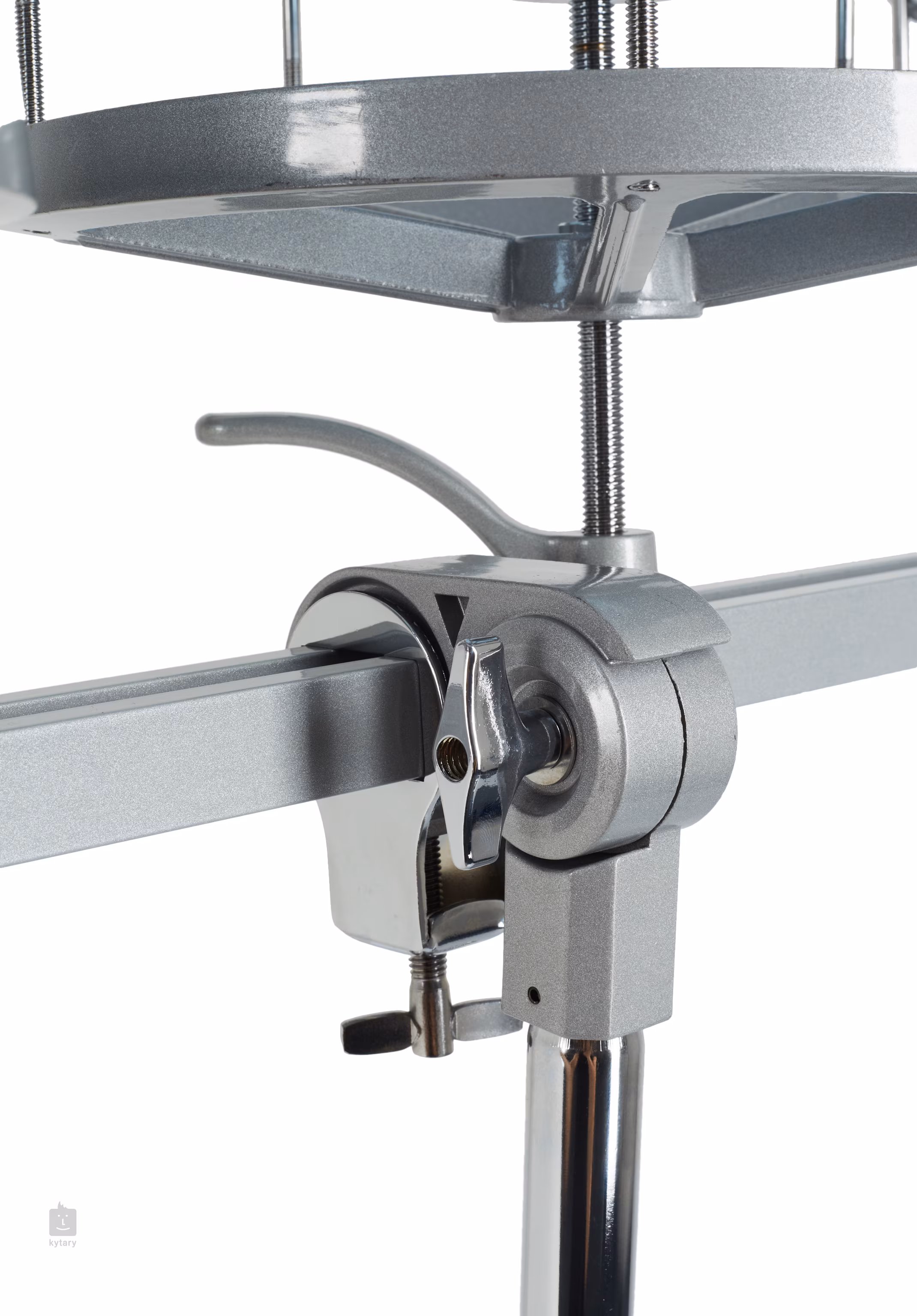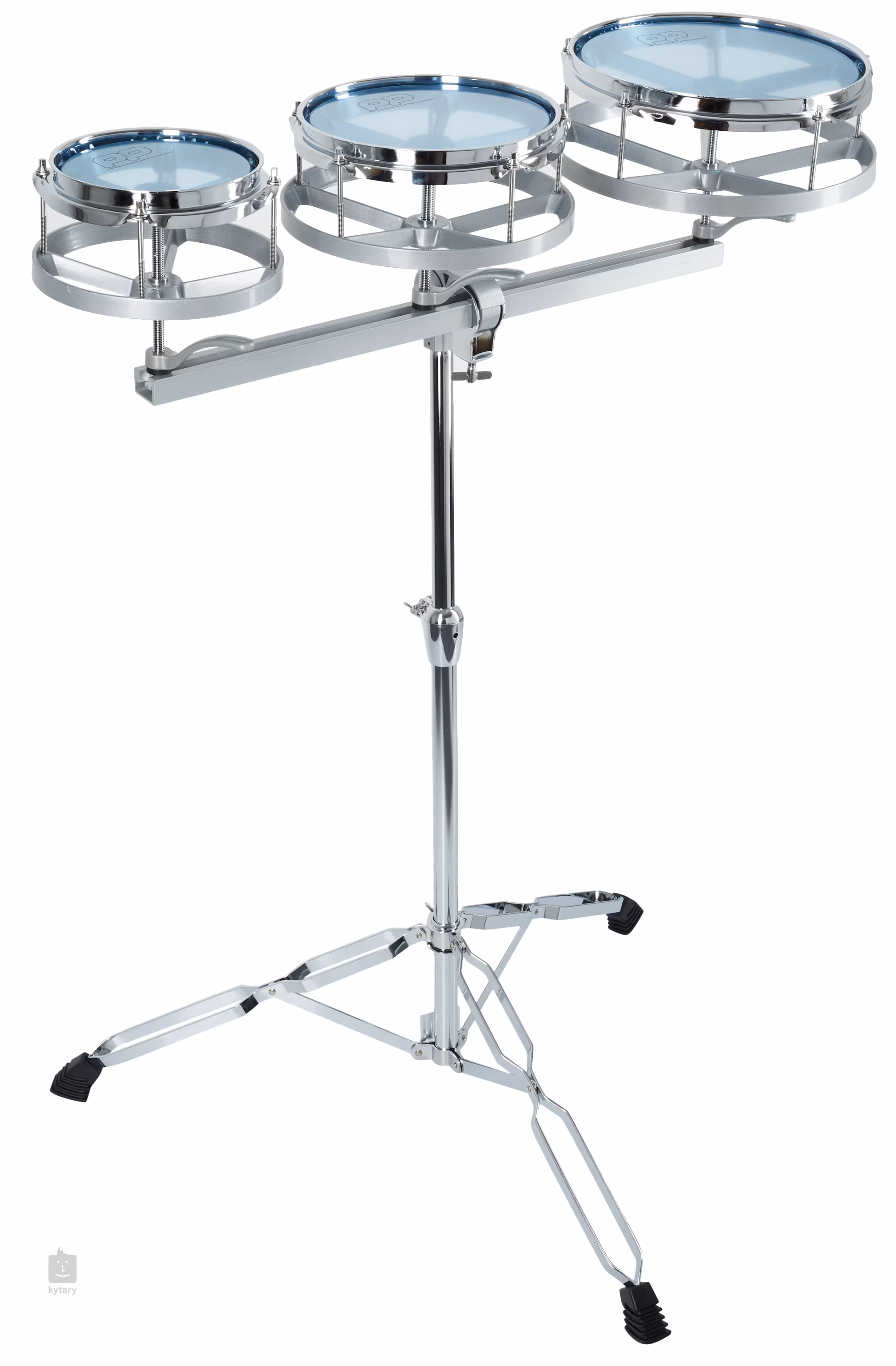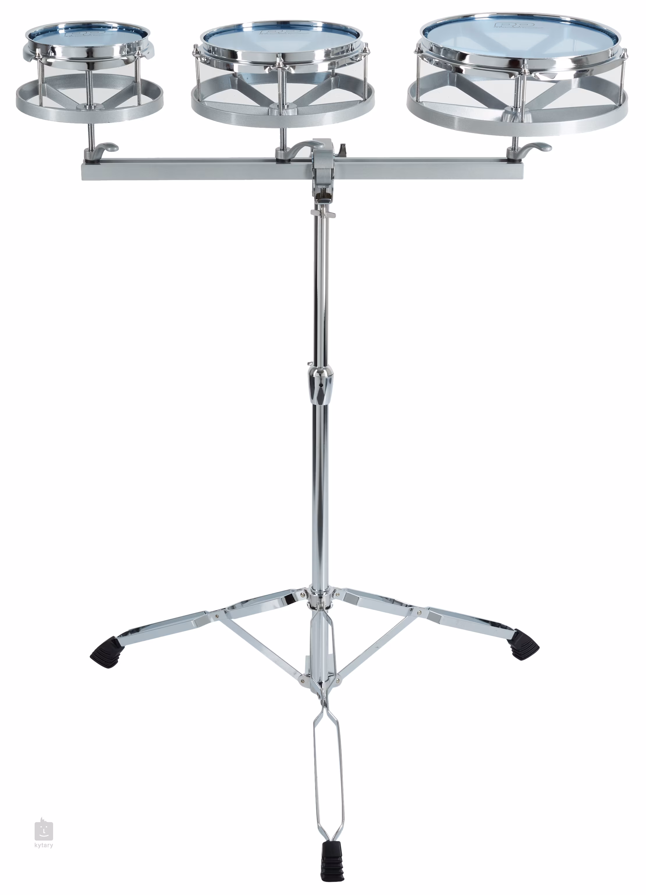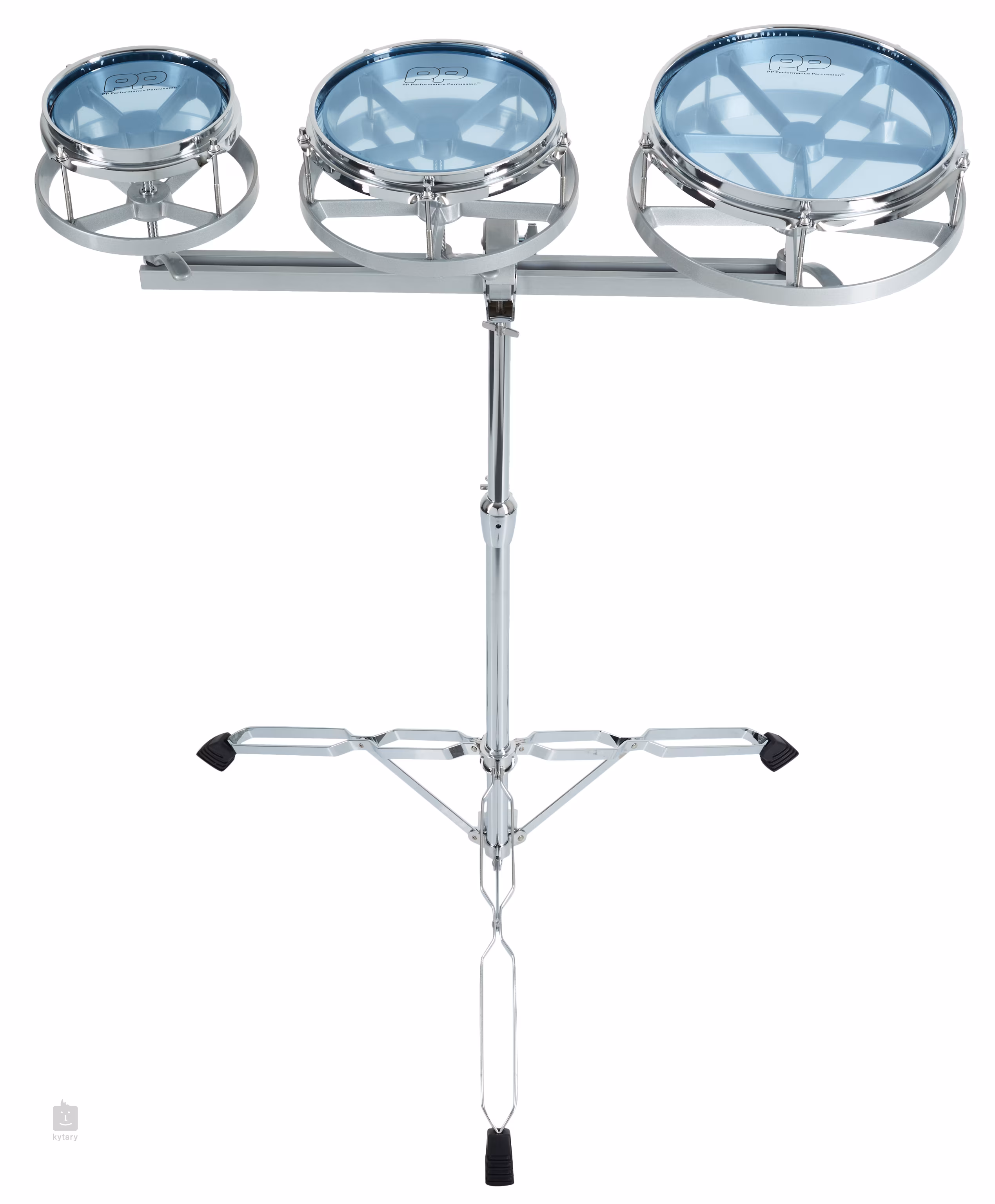 Set aus drei Toms mit Metallrahmen auf einem verchromten, voll verstellbaren Stativ mit Gummifüßen, die ein ungewolltes Verrutschen verhindern. Die maximale Höhe beträgt 107 cm und die minimale 76,2 cm.