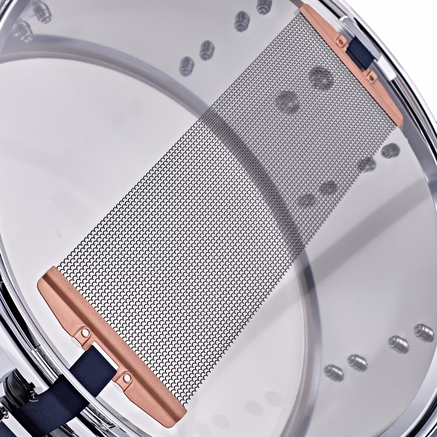 Für eine präzise Snare-Ansprache sorgen 42 Snare-Stränge, die einen satten, volleren und klanglich komplexeren Sound liefern. Eine größere Anzahl von Kontakten mit dem Resonanzfell erzeugt einen intensiveren „Buzz“, der dem Klang Tiefe und Textur verleiht. Diese Konfiguration erweitert gleichzeitig den Dynamikbereich und verbessert die Kontrolle über Lautstärke und Klangfarbe, was sowohl Live-Musiker als auch Studiomusiker zu schätzen wissen.