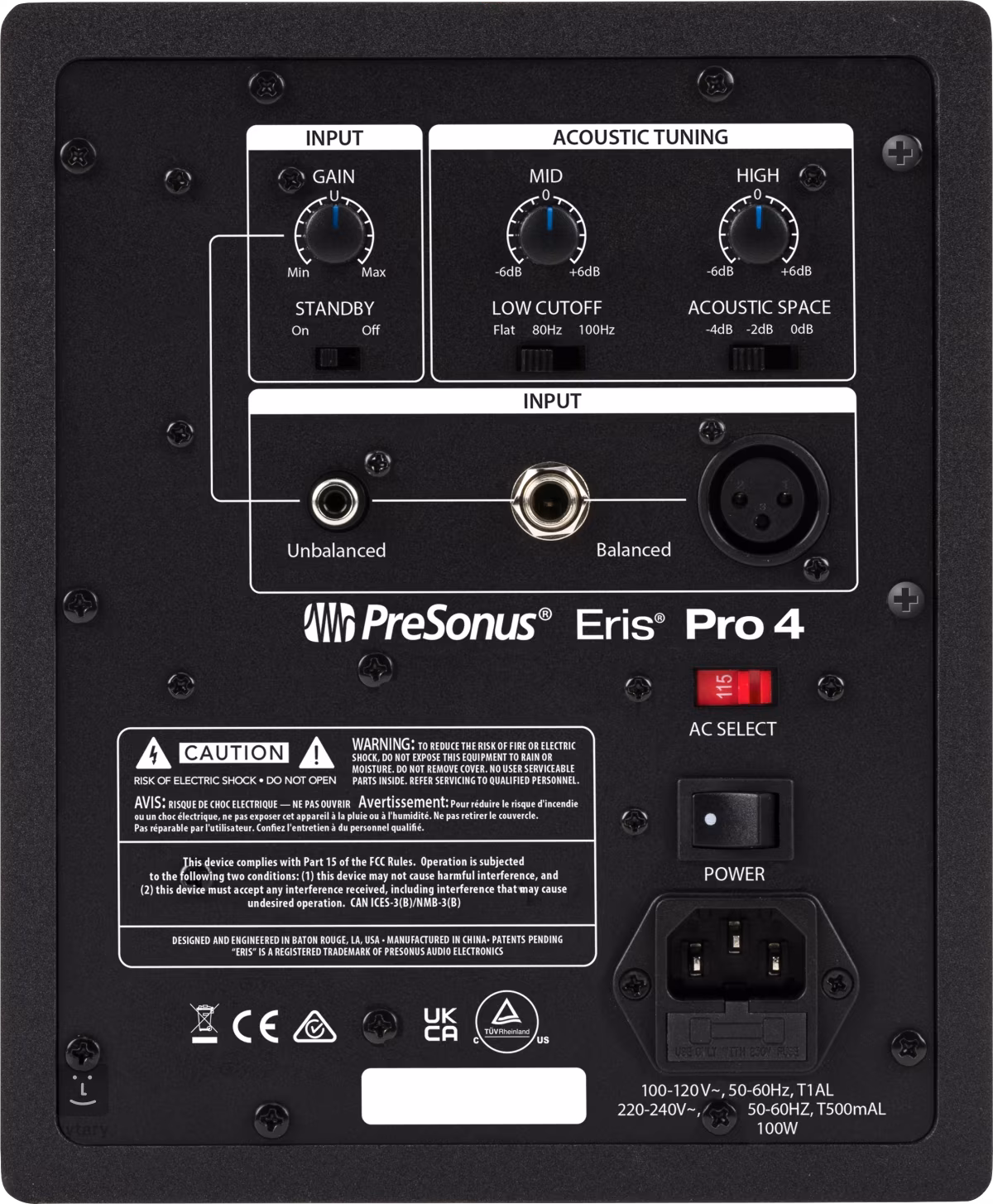 Eine der wichtigsten Eigenschaften dieses Monitors ist seine Fähigkeit, sich an unterschiedliche akustische Umgebungen anzupassen. Der Benutzer kann mehrere Parameter in der ACOUSTIC TUNING-Sektion auf der Rückseite des Monitors einstellen (insbesondere gibt es eine Option zur Anpassung der Mitten und Höhen von -6 bis +6 dB, einen LOW CUTOFF-Schalter zur Auswahl der unteren Bandbegrenzung - geeignet für die Kombination mit einem Subwoofer - und ACOUSTIC SPACE für die spezifische Platzierung), wodurch der Klang für einen bestimmten Raum optimiert werden kann. Diese Funktion macht den ERIS PRO 4 zu einer hervorragenden Wahl für eine Vielzahl von Anwendungen, vom Heimstudio bis hin zu professionellen Umgebungen.