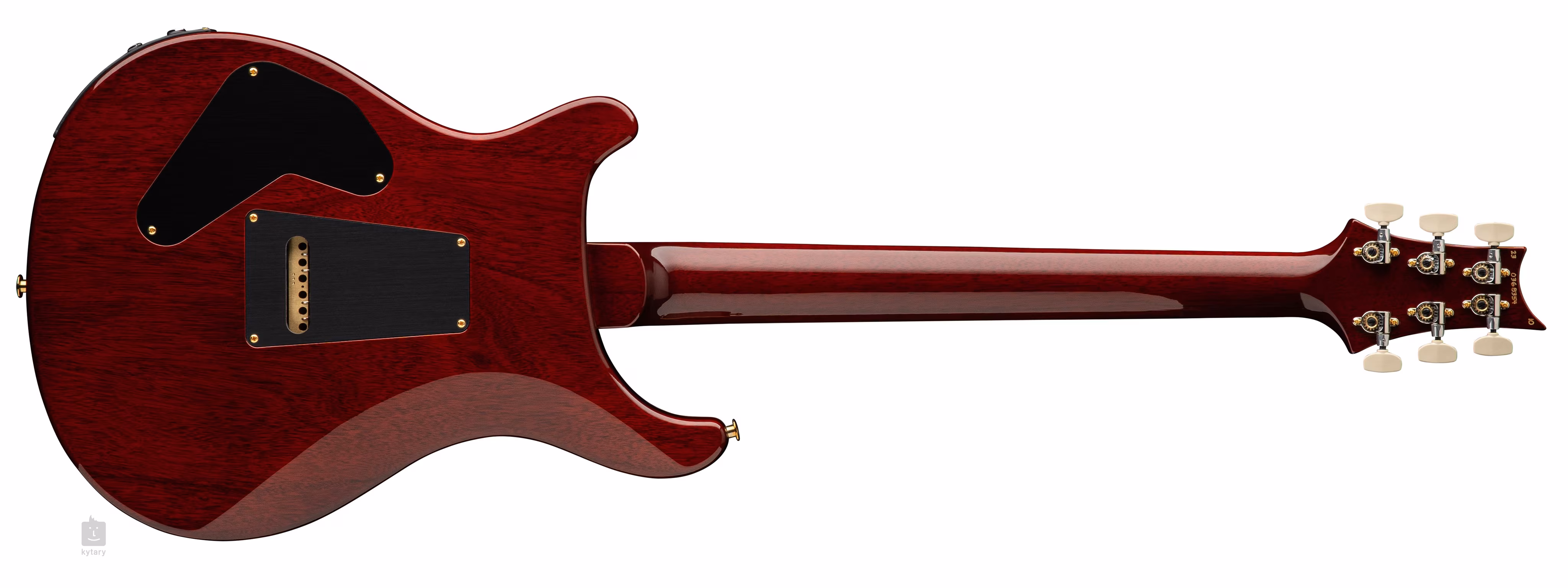 Das Modell Custom 24 Piezo Dark Cherry Sunburst besticht auf den ersten Blick durch die Kombination eines ergonomisch geformten Mahagoni-Korpus mit dem typischen PRS-Double-Cutaway und einer gemaserten Ahorndecke mit cooler Holzmaserung. Ein einteiliger Mahagoni-Hals mit Pattern Thin-Profil ist mit einem Palisander-Griffbrett mit vierundzwanzig Bünden verleimt. Die Orientierung auf dem Griffbrett wird durch die PRS-typischen Positionsmarkierungen in Form von perlmuttfarbenen Vogelsilhouetten erleichtert.